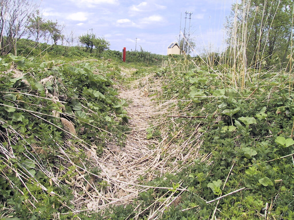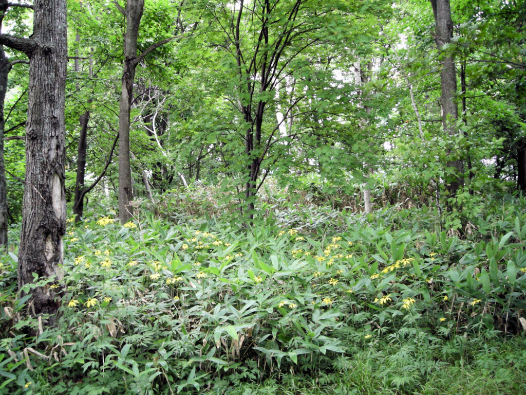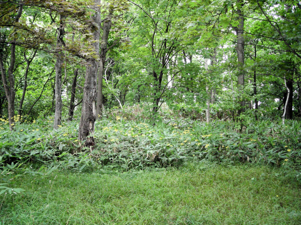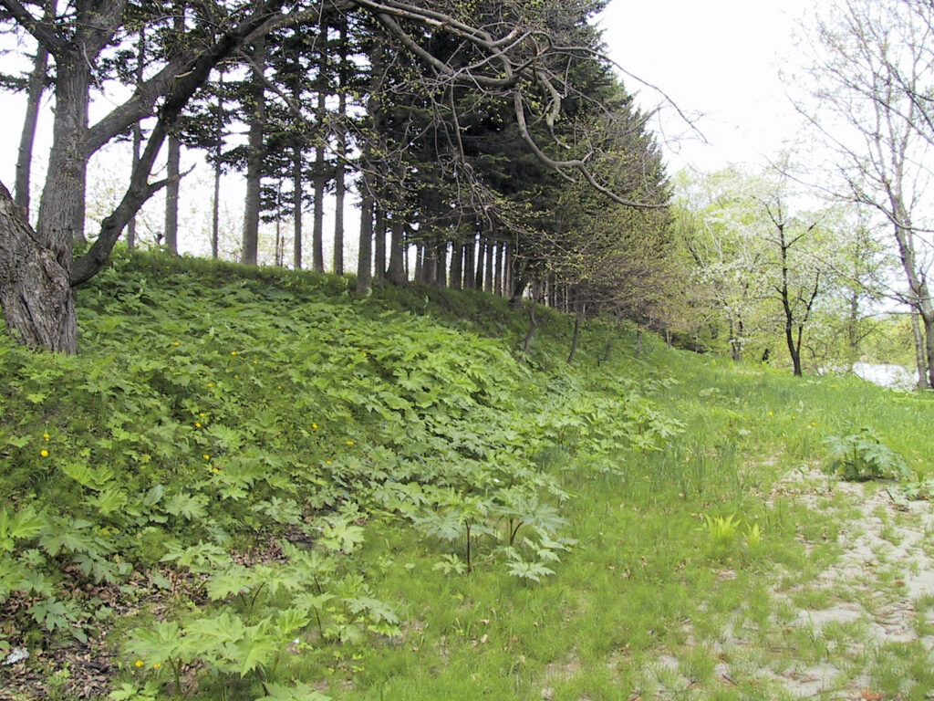 旭川の菅原さんのお話では「なかなか良い土塁がある」とのことでしたが、時期が時期だけにやはり予想通り笹藪だらけでよく確認できませんでした。なんとなく奥の方がこんもりと草が盛り上がっているので、その辺りに壕や土塁があるのではないかと思いますが、よく分かりませんでした。やはり秋か春に来ないと確認は無理そうです。