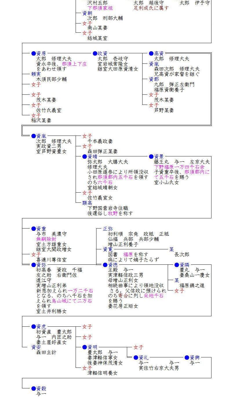 『寛政重修諸家譜』では忠清の子孫康清が下野国那須郡に移り住んだとありますが、この忠清から康清そして資清に至る系譜も議論があるようです。ここでは『系図研究の基礎知識 第一巻』所載の「武蔵七党系図」によりました。