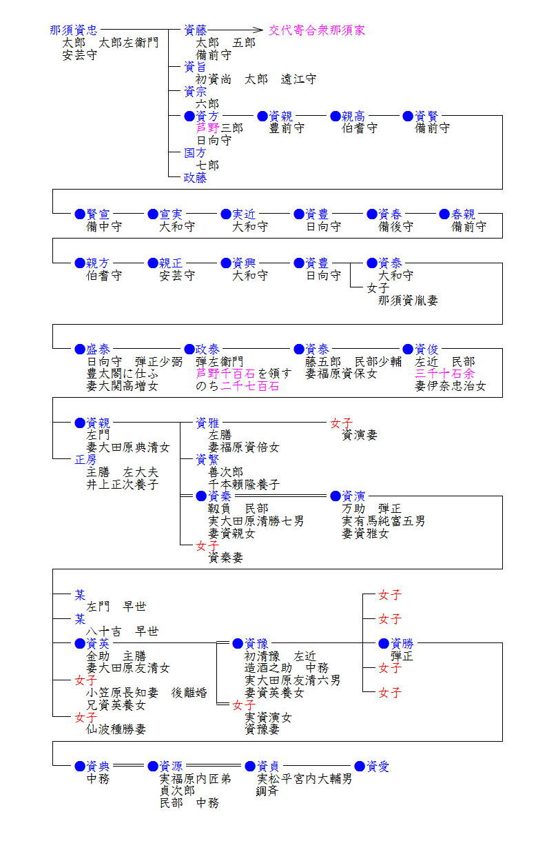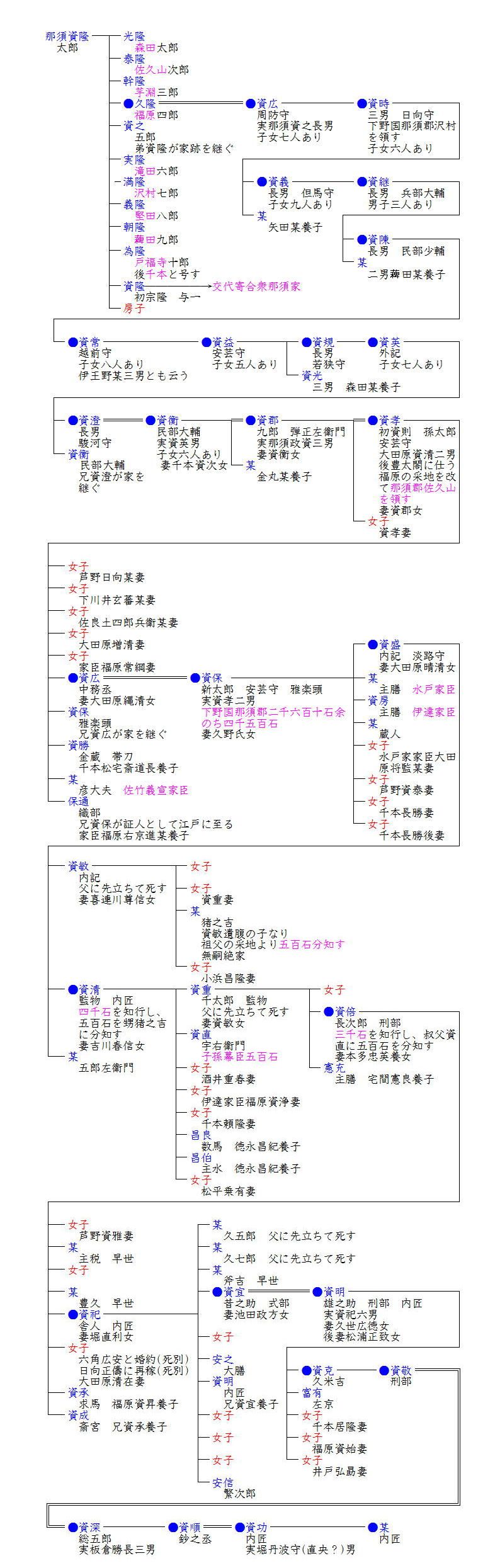 この家の出自ですが謎に包まれています。『続群書類従』の「那須系図」「千本系図」などでは、藤原道長の子長家の子に通家をおきその子孫とするなどし、すべて藤原姓としていますが、どうやらそうではなく古代の那須国造の後裔のようです。資房以降はどの系図でも一致しますので間違いないところだと思いますが、それ以前にはどの系図にも問題があるようです。上記の系図のはじめの部分は『古代氏族系譜集成』に拠りましたが、一番はじめの「大臣命」は、阿部氏族の建沼河別命の孫のようです。