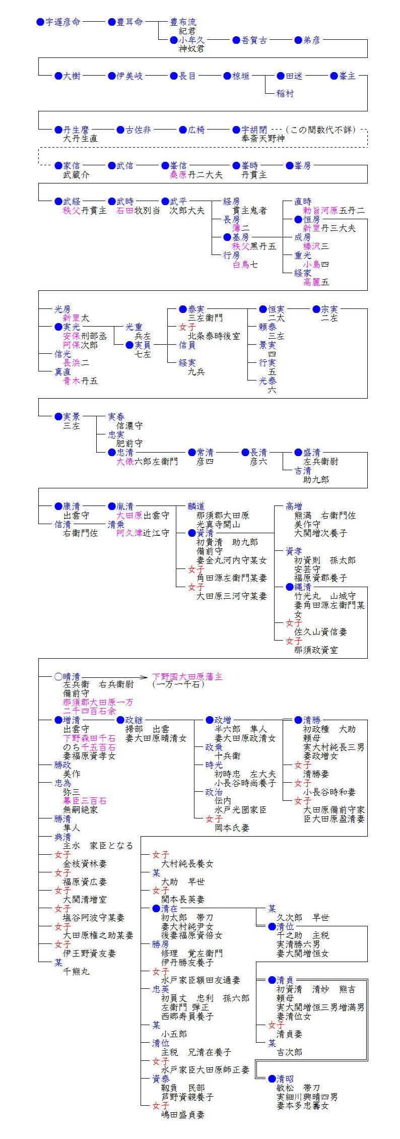 那須七騎の大田原家・大関家はこの安保氏の後といわれています。しかしその祖忠清は『系図綜覧』所載の「武蔵七党系図」には名前がなく、そのつながりは曖昧です。