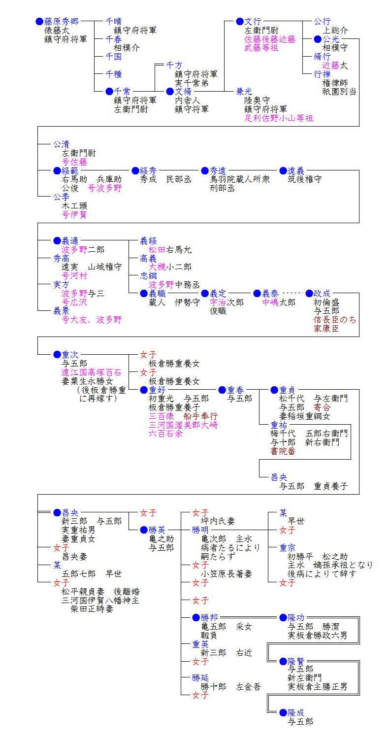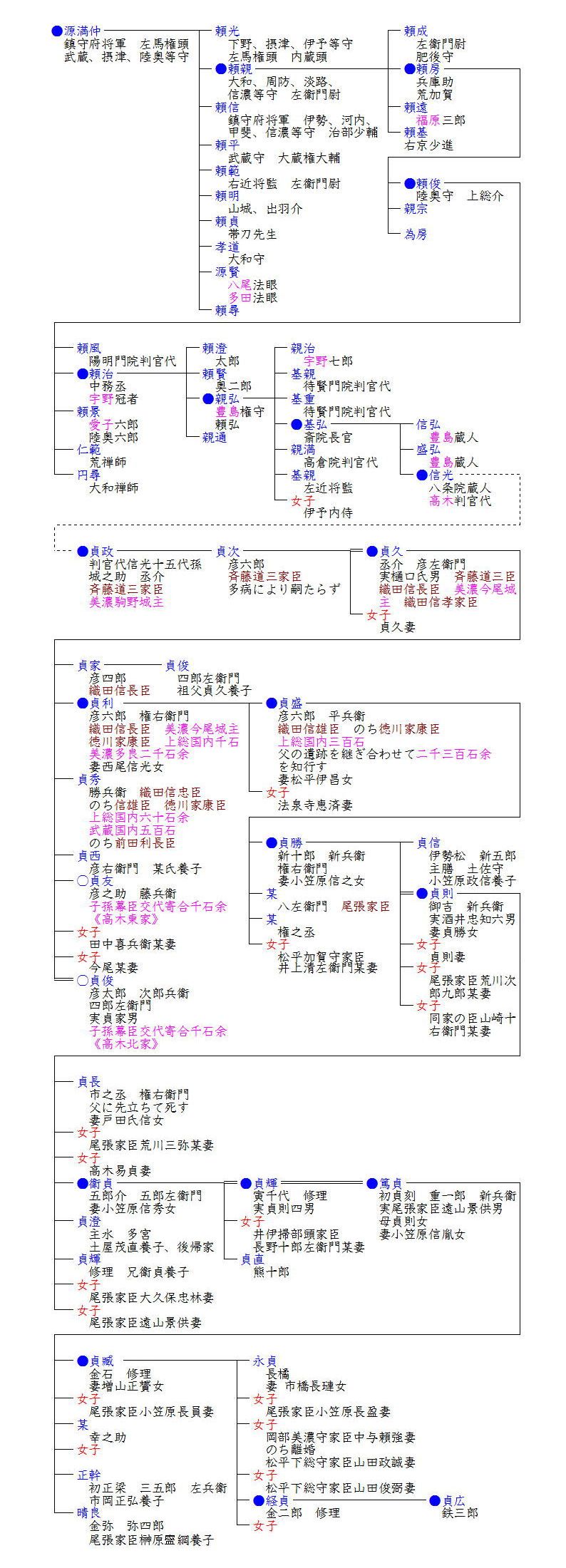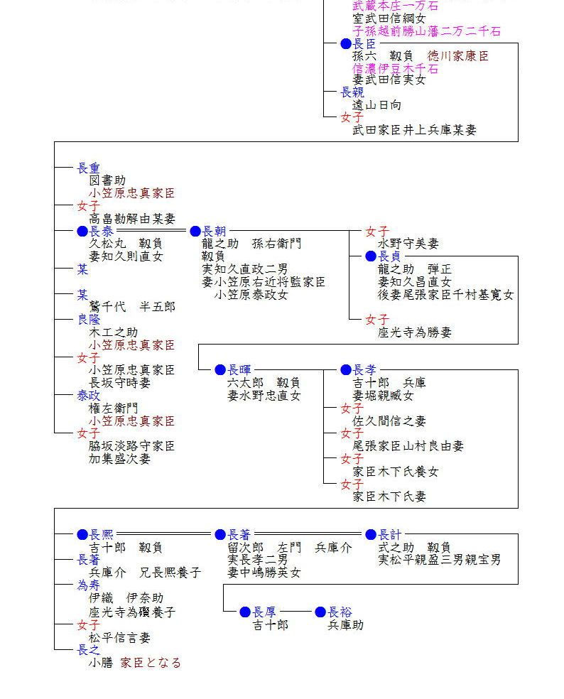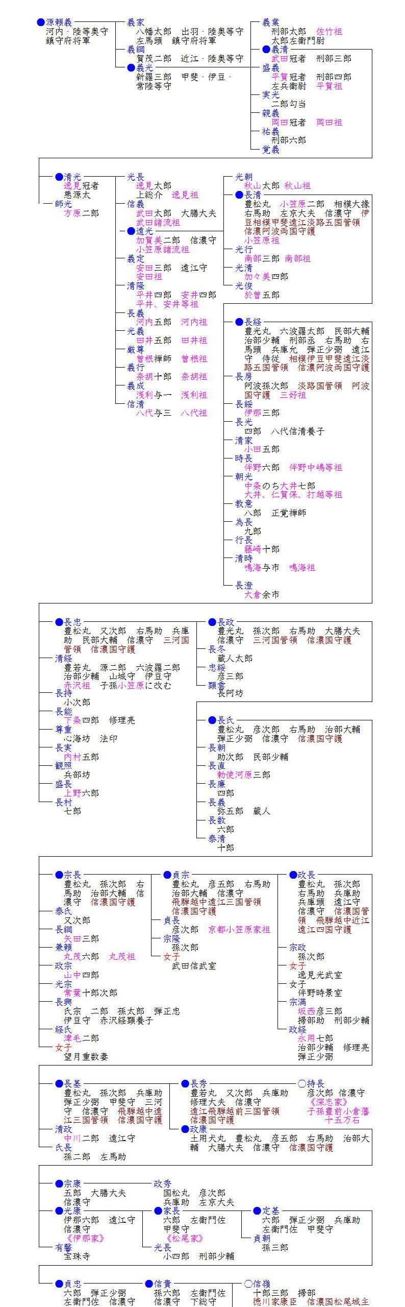 この一族はすこぶる多く、全国的に広がっていますが、その系図は異同が多く相当作為が加わっていると思われます。ともかく鎌倉時代の小笠原氏のことはあまり明かでなく、長忠の子孫が室町時代になって信濃国の守護をほぼ世襲するようになったので自ずから嫡宗家と見なされるようになったようです。