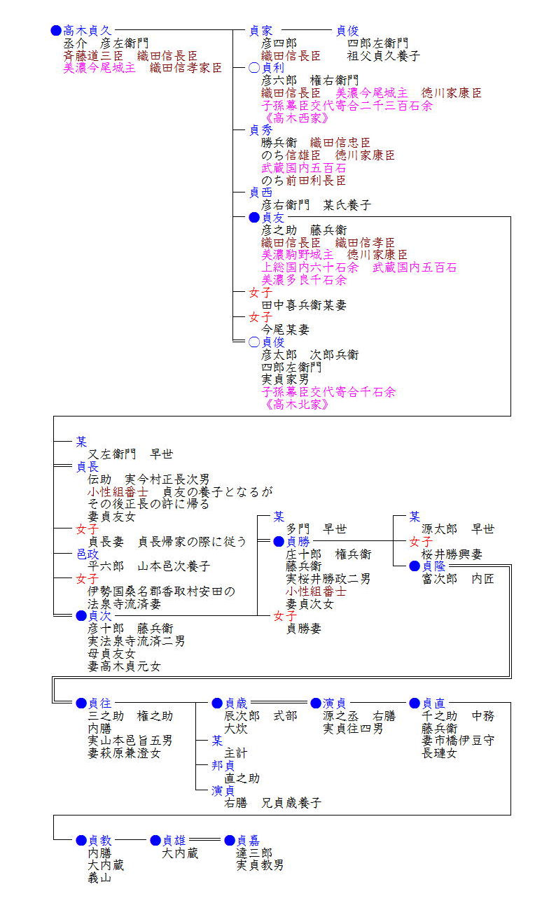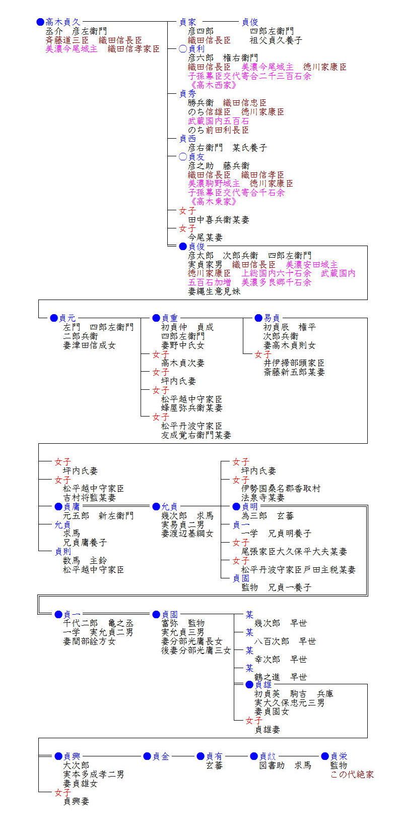 今回の高木(西)家よりは「美濃衆」と呼ばれる諸家になります。この高木家は清和源氏頼親流と言われています。頼親の子孫は頼親が大和守となり、以後大和を地盤としたことから大和源氏と呼ばれていますが、その子孫の高木判官代信光が高木家の祖と言われています。この子孫では河内丹南1万石の大名となった三河の高木氏があり、この美濃の高木氏もそれと同じく信光の子孫を称していますが、『寛政重修諸家譜』では貞政以前の系譜は不明で、その出自は明かではありません。