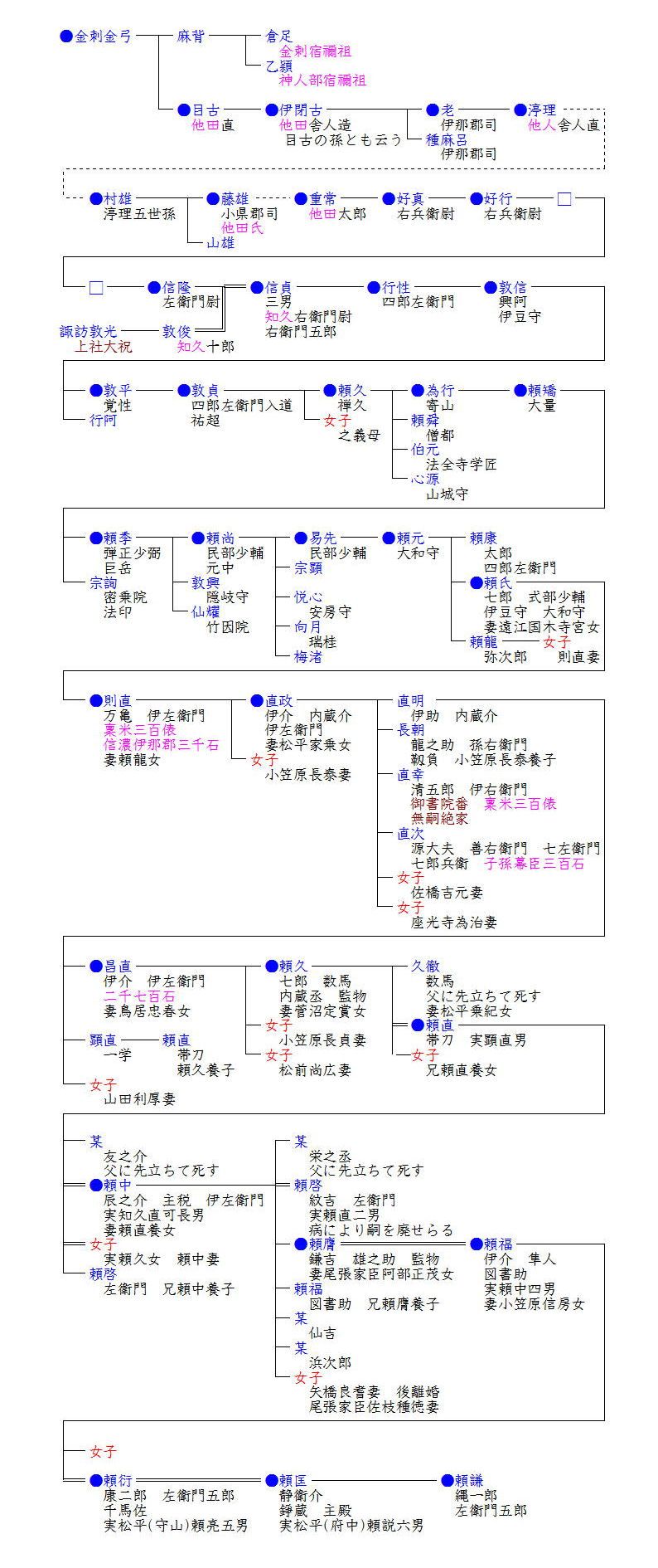 他田左衛門尉信隆の三男信貞が上社大祝敦光の子知久十郎敦俊の養子となり知久右衛門尉を称し、伊那郡の土豪として続きました。南北朝の頃は南朝に属しました。頼元は武田信玄と戦い没落しましたが、その子頼氏は信長・家康に仕え、その子則直の時に采地三千石を賜い交代寄合に列しました。