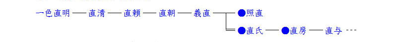 この一色家の祖直明は、家伝によると足利将軍義量の孫義嗣の次男で一色氏兼の子長兼の養子となったとしていますが、義量は早世して子がなく、義嗣はその叔父であるので疑わしいと『寛政譜』ではしています。武蔵国葛飾郡幸手庄を領していましたが、直明の玄孫義直の時に徳川家康に本領を安堵され、5160石を領しました。息子照直は加増され7160石余を領し、交代寄合となりましたが、嗣子なく父義直が再仕し、外孫直氏が5160石を相続しました。その子直房は4500石を継ぎましたが、病身のため江戸に居住し、交代中絶となりました。子孫は、3500石の旗本として存続しています。