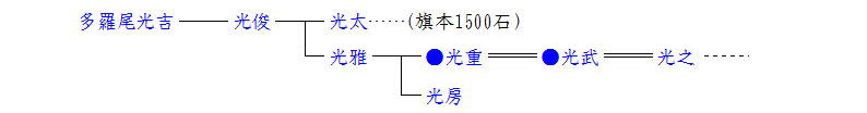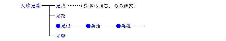 光義の三男光俊は、父の遺領の内3250石を領しました。『呈書書込』『諸家系譜』によると光俊、義治は交代寄合に列しましたが、義雄家督後分知減高に付き伺いの上交代御免となったそうです。子孫は2000石の旗本として存続しています。