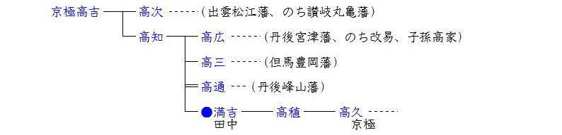 この京極家は、室町幕府の四職をつとめ、江戸時代は数家の大名を出した京極家の一族です。丹後宮津で12万3200石を領した高知の六男満吉を祖としますが、満吉は田中を称し、交代寄合に準ぜられました。のち書院番士に列し、稟米1000俵を賜い、孫高久の時に京極姓に復し、子孫は1000石の旗本として存続しました。