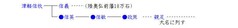 この津軽家は、陸奥弘前藩津軽家の分家です。津軽信牧の次男信英が5000石を分知され、その子信敏の時には弟信純に1000石分知して4000石となりました。政兕(たけ)は家督後小普請入し、交代寄合の列からは外れたようですが、親足の代には本家より6000石を分与され、1万石で大名に列し、明治維新まで存続しました。