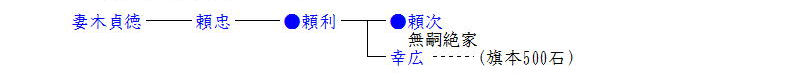 妻木家は美濃土岐氏の一族ですが、頼忠の時に徳川家康に仕え、その子頼利は7500石を知行し交代寄合に列しました。その子頼次は弟幸広に500石を分知して7000石を領しましたが、嗣子なく絶家となりました。幸広の子孫は500石の旗本として存続しました。