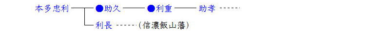 この本多家は三河岡崎藩(のち信濃飯山藩)本多家の分家です。家祖の助久は本多忠利の長男ですが、庶子であったので家督を継がず4560石余を分知され寄合に列しました。『呈書書込』『諸家系譜』によると助久・利重が交代寄合・帝鑑間席とあるそうです。子孫は4260石余の旗本として存続しました。