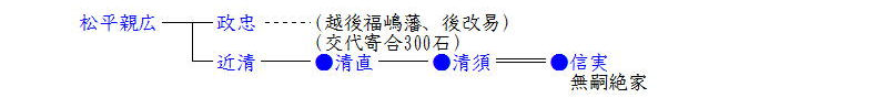 この松平(長沢)家は、(35)松平(長沢)家の一族で、上野介親広の五男近清を祖とします。近清の子清直は松平忠輝の付家老となり、忠輝改易の時に浪人となります。のち再び幕臣となり三河形原にて5000石を賜い、交代寄合に列しました。しかし三代信実の時に嗣子がなく絶家となりました。