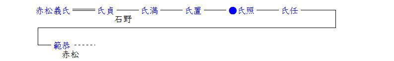 赤松家は室町幕府の四職の一として知られていますが、この赤松家はその一族で、赤松円心(則村)の長男範資の子孫に当たります。氏貞の時に石野城に住し以後石野と称し、その子氏満は豊臣秀吉・前田利家に仕え、その子氏置は徳川家康に仕え、3150石余を知行しました。氏置の子氏照は2150石余を相続し、上総国の采地に住し、のち新田を合わせ2510石余を知行しました。のち参府して書院番士となり、孫範恭の時に赤松姓に復し、子孫は5015石余の旗本として存続しました。