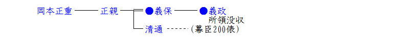 岡本家は宇都宮芳賀の末流岡本信濃守富高の後胤で、下野塩谷庄に住したそうです。正親の時に豊臣秀吉に塩谷庄内3360石を安堵されました、義保より徳川家に仕え、加増され3860石を領しました。しかし義政は故ありて采地を没収され、岡本家は断絶となりました。