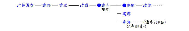 近藤家は藤原北家秀郷流で秀郷の後胤近藤左近将監長安が三河に住し、その末孫九十郎景春から『寛政譜』の系図は始まっています。景春の孫重勝は織田家の臣間見仙千代に属し、その死後堀秀政に属し5000石を与えられました。秀政の死後はその次男親良に属し、越後において1万石を与えられました。重勝の養子政成(堀秀政四男)は徳川家康に仕え、父の遺領1万石を賜いましたが、その子重直(重尭)は幼かったため、信濃高井郡川中島にて5000石を賜り、寄合に列し、残り5000石は伯父堀親良に賜り、重直の成長まで親良が後見することを命ぜられました。重直の死後、子重信が4300石を継ぎ、700石を甥(実弟)重郷に分知しました。重直(重尭)・重信の代は交代寄合であったようですが、のち願いにより若年寄支配となったようです。子孫は4300石の旗本として存続しました。