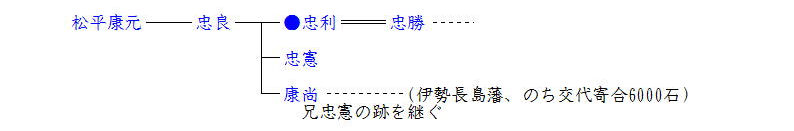 此の松平(久松)家は、このシリーズの2番目の松平(久松)家の分家になります。徳川家康の異父弟康元の子で美濃大垣5万石を領した松平忠良の長男忠利が家祖ですが、庶子であったため父の跡は弟忠憲が継ぎ、忠利は父の遺領の内5000石を分知され、寄合に列しました。忠利は寛永の頃に交代寄合に列したようですが、その後免ぜられたようで、子孫は5000石の旗本として存続しました。