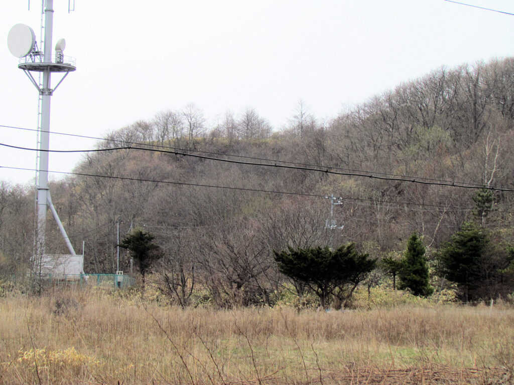 この日はmixiのお城巡りコミュの「全国一斉お城の日」だったので、久しぶりに道の駅とチャシ巡りの旅に行ってきました。出かける前の資料収集段階で、『アイヌ民族博物館だより No.9』に「白老町のチャシと新発見の事例」(佐藤政憲)という論文を見つけ、それにこのチャシのことが載っていたのを見つけ、地図で場所も確認していました。その論文によると弧状の壕が1条ある丘頂式のチャシであるとのことでしたが、行ってみると民家(?)か何かの会社の建物があり、その裏山がチャシの場所のようでした。入り口には立入禁止の札があったので、近づくのは断念し、遠景を撮影しただけで次へ移動しました。(2012/04/29)