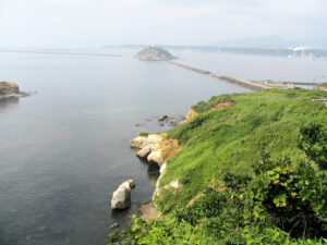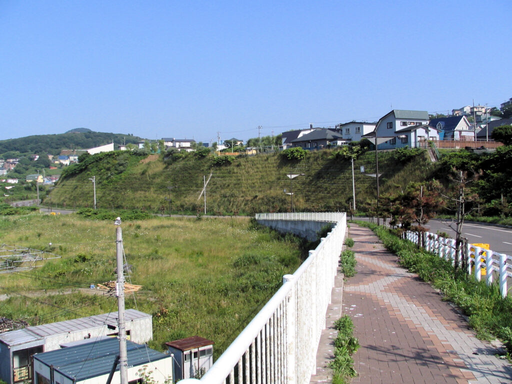 南部藩陣屋のあと、また水族館の駐車場で昼食を摂って、道の駅の辺りをウロウロした後、絵鞆岬の方へ行きました。目指す場所は「港湾関係者以外立ち入り禁止」との看板があったので裏側からまわり、エンルムチャシがあったと思われるのが下の写真の場所で、上の写真でいうと中央の島に伸びている堤防の付け根の辺りになるでしょうか?(2006/8/9)