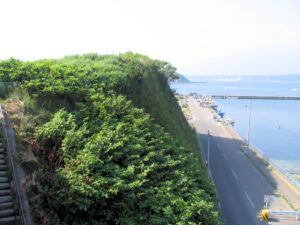 カムイチャシは内浦湾に突き出た茶津崎にあり、先ほどの展望台から岬の方へと進むと、途中のくびれた部分に一条の壕が認められます。いわゆる丘先式のチャシに分類されるものです。丁度くびれた部分なので壕の長さは15mほどしかありません。深さは2~3mといったところでしょうか?