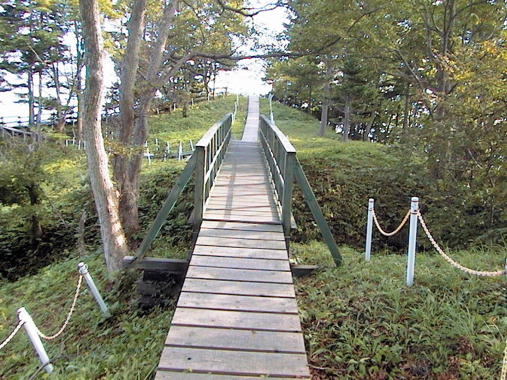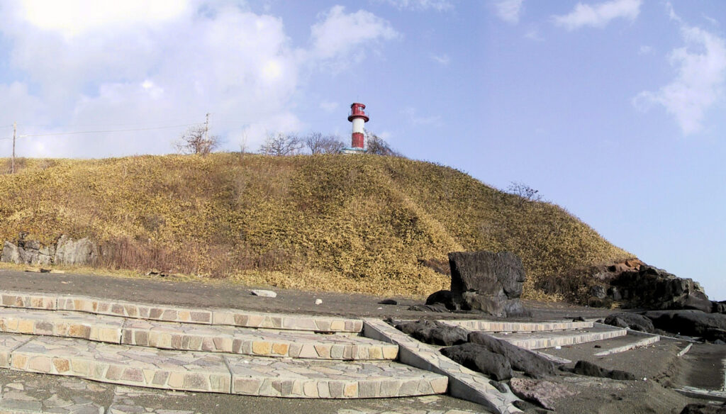 『日本城郭大系』によると、この灯台が建つ前に一部発掘調査が行われているそうです。また、半円形の一条の壕があり、その長さは100m、幅は広いところで5m、狭いところで3m、深さは2m前後、掘り上げた土は壕の外側に土塁状に積まれていたそうです。また壕に堆積していた火山灰の年代から寛文3(1663)年の有珠山の噴火以前、そう遠くない時代に作られたようです。