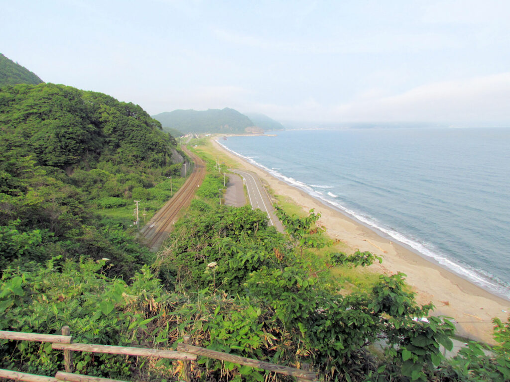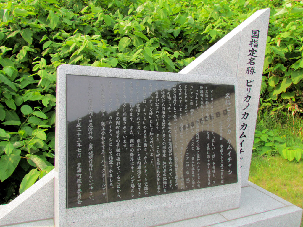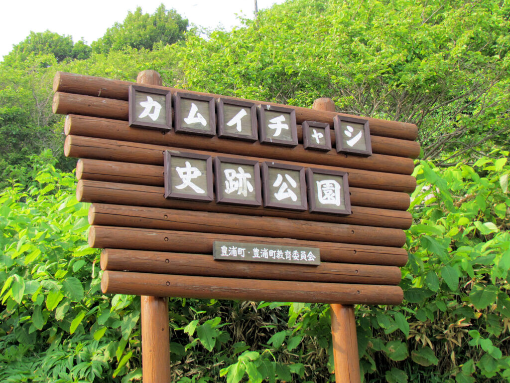 長万部町から高速道を使って豊浦ICまで戻り、そこから国道37号線を長万部方面へと進みました。山を下って平坦になったところで、「カムイチャシ史跡公園」という標示板を見つけたので、そこから左折、海沿いの道をしばらく進むとカムイチャシトンネルの手前左側にカムイチャシ史跡公園の看板がありました。そこから上へと伸びる急な階段を登り、登り切った所にある展望台からはカムイチャシの全体が見渡せます。