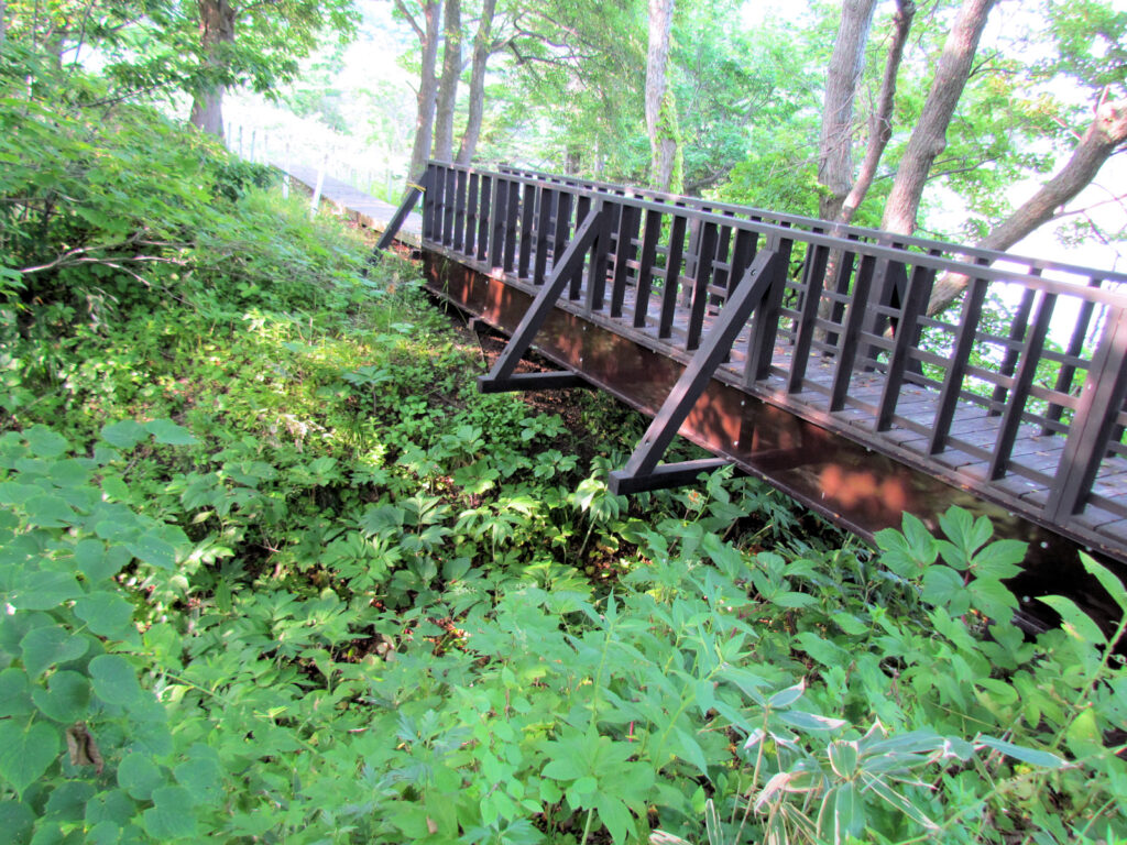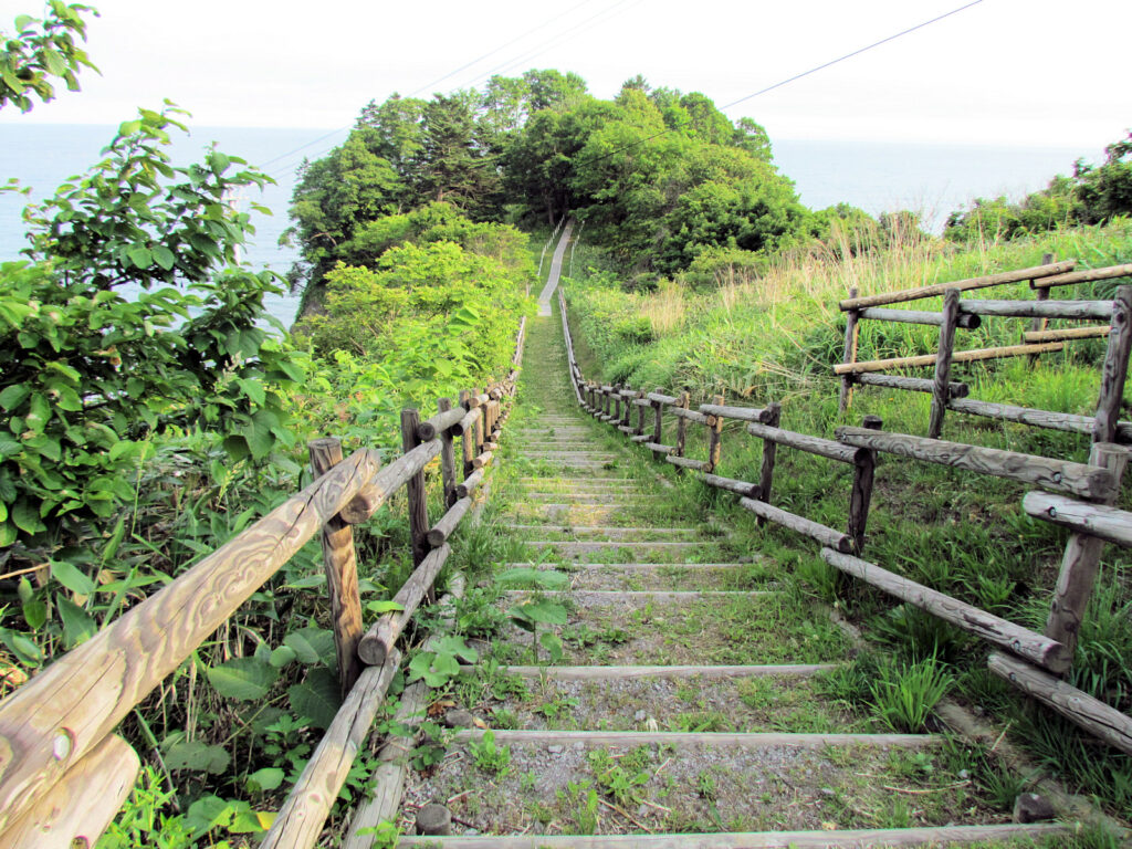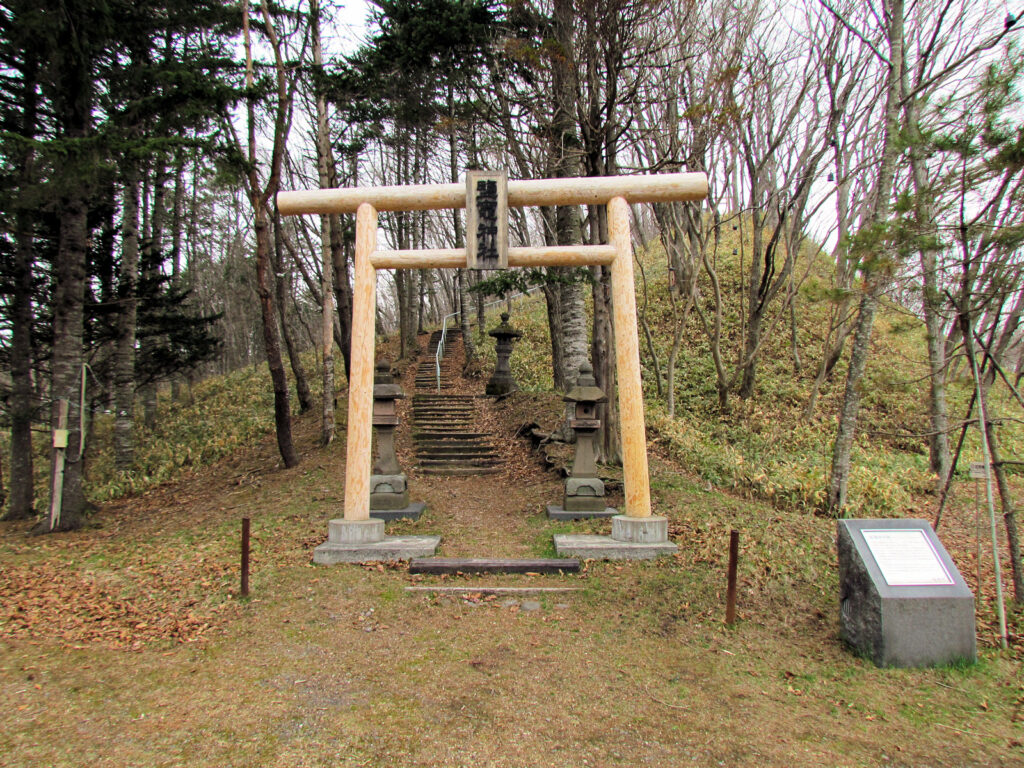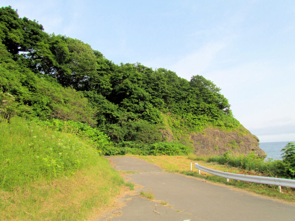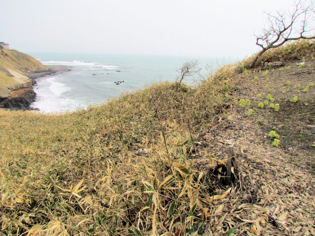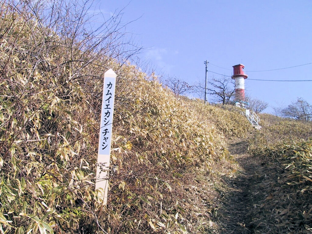 砂浜の手前に車を止め、灯台への階段を上ると、町教委が建てた「カムイエカシチャシ」と書いた標柱を発見しました。これで間違いないと思い、登りましたが、確かに灯台のある台地の天辺は一段高くなっていましたが、周りは笹藪で壕の存在は確認できませんでした。少し藪に入ってみましたが、2,3mすすんだ所でこれは無駄だと悟り撤退しました(^^;)