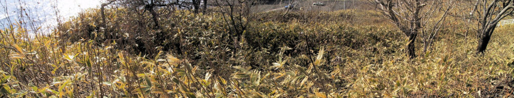 1回目は笹藪が深くて遺構を確認できなかったので、そろそろ藪も薄くなったかなと思い11月にもう一度訪れてみました。このチャシの場所には現在灯台が建っていますが、灯台で何か工事でもしているのか、前回灯台のまわりに伸び放題になっていた笹藪ははきれいに刈り取られていました。その外側の壕とおぼしき辺りは残念ながら笹が残っていましたが、少し枯れて壕の形が少し分かるようになっていました。ちょうど海にむかってU字型というかコの字形というか、囲むような形に壕がなっていました。深さは2mほどあるでしょうか。『日本城郭大系』には掘り上げた土を外側に土塁状に積まれているとありますが、壕の外側の方はよく分かりませんでした。背後の方は若干盛り上がっているような感じがしました。(1999/11/21)