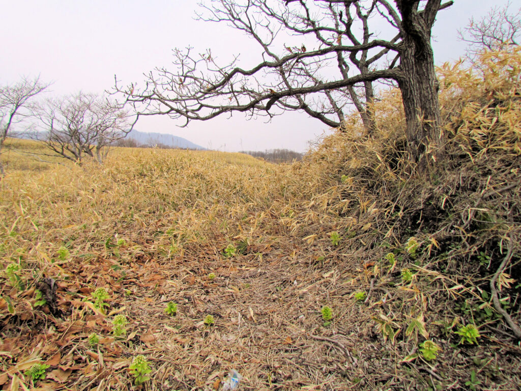 この日はmixiのお城巡りコミュの「全国一斉お城の日」だったので、久しぶりに道の駅とチャシ巡りの旅に行ってきました。ここはカムイエカシチャシのすぐ向かいにありますが、笹藪がひどくてのぼれないので、いつもカムイエカシチャシから眺めています。カムイエカシチャシの発掘調査の時の資料に載っている地図を見ると、このチャシは写真を撮った側じゃなくて、山のてっぺんを超えた向こう側(海に面した方)にあるようですが…(2012/04/29)