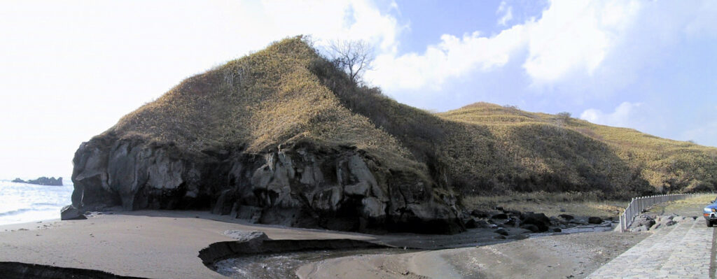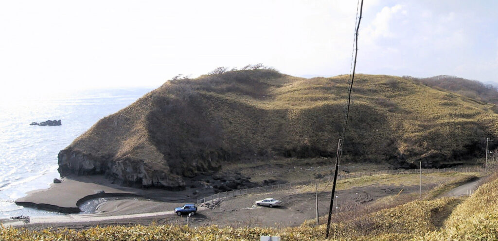 この岬の南側・東側・西側は断崖絶壁になっており、まさに要害の地です。チャシにもいろいろと性格がありますが、これはまさに砦としてのチャシでしょう。(丁度海に面しているので見張り台としての性格もあると思いますが) 壕の壁面および排土上に10cmぐらいの礫が葺き石のようにあるそうですが、私は確認し忘れました(^^;)