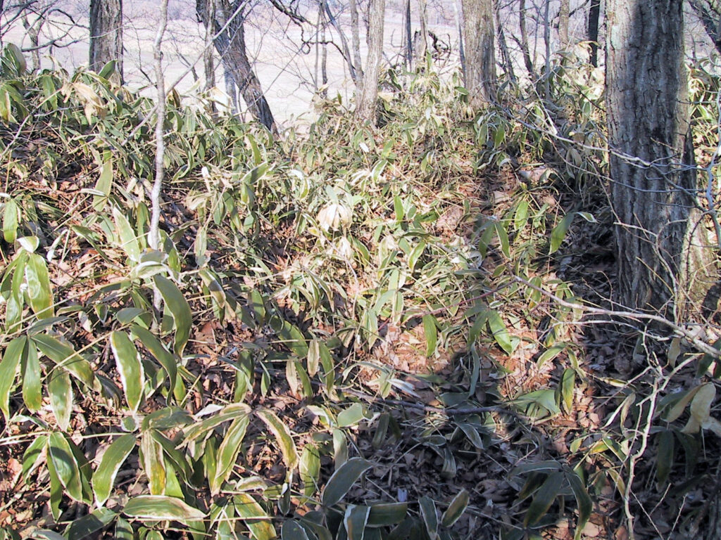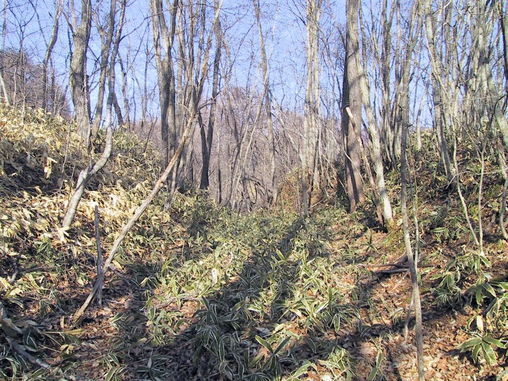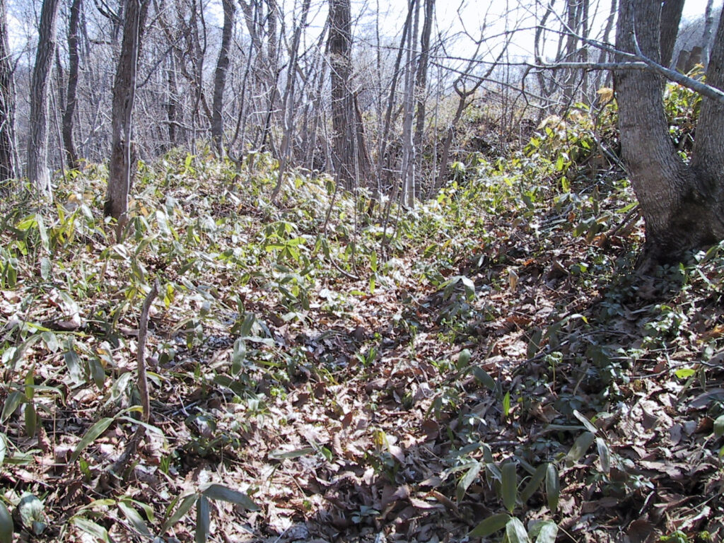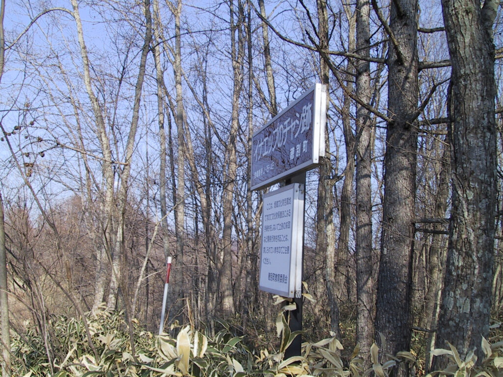 看板があるので、そちら側がチャシなのかと思いきや、看板の右側の方に二段の壕らしきものがあって台地が区切られていたので、そこがチャシだったようです。とはいっても、壕で区切られている部分の広さは畳数枚程度しかなく、壕も深さ1mもない感じですので砦というより見張り場的なものだったような気がします。(2001/4/21)