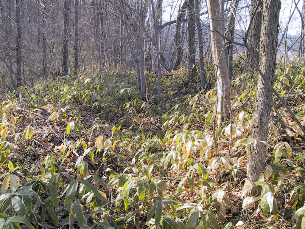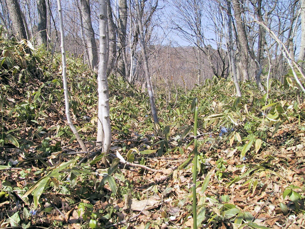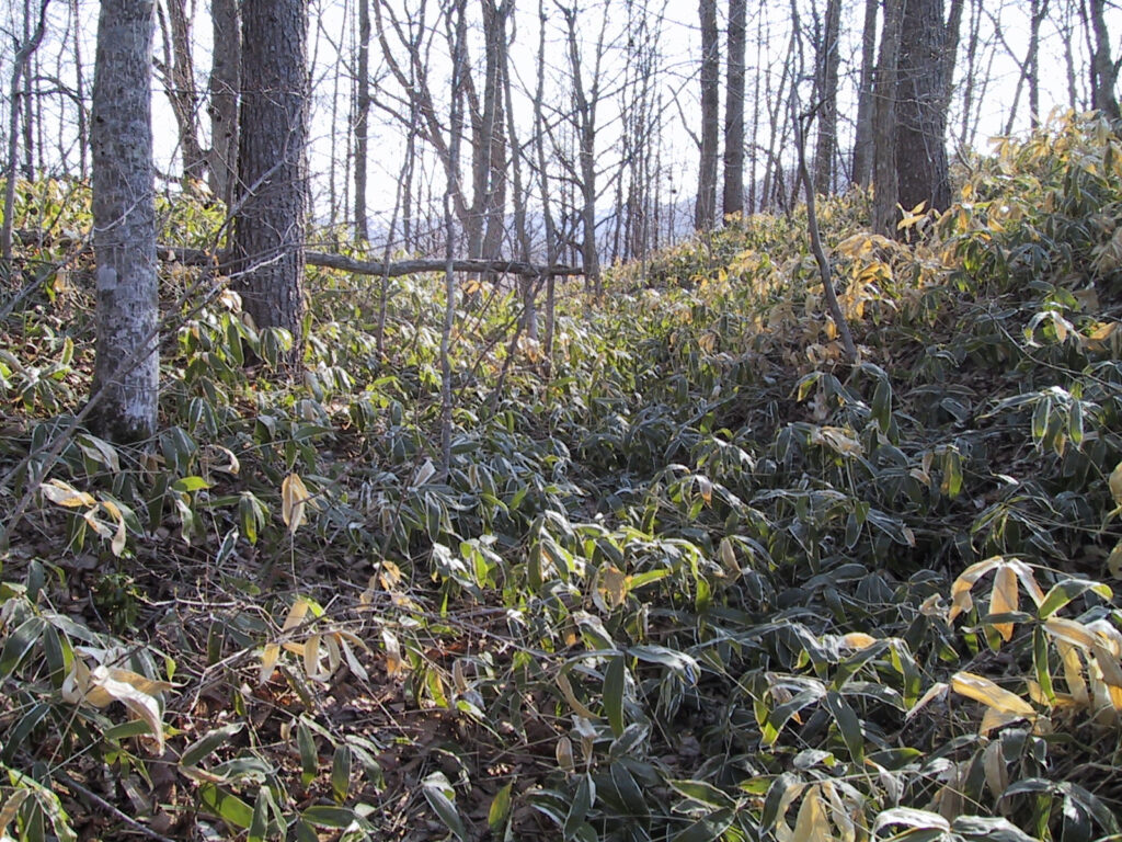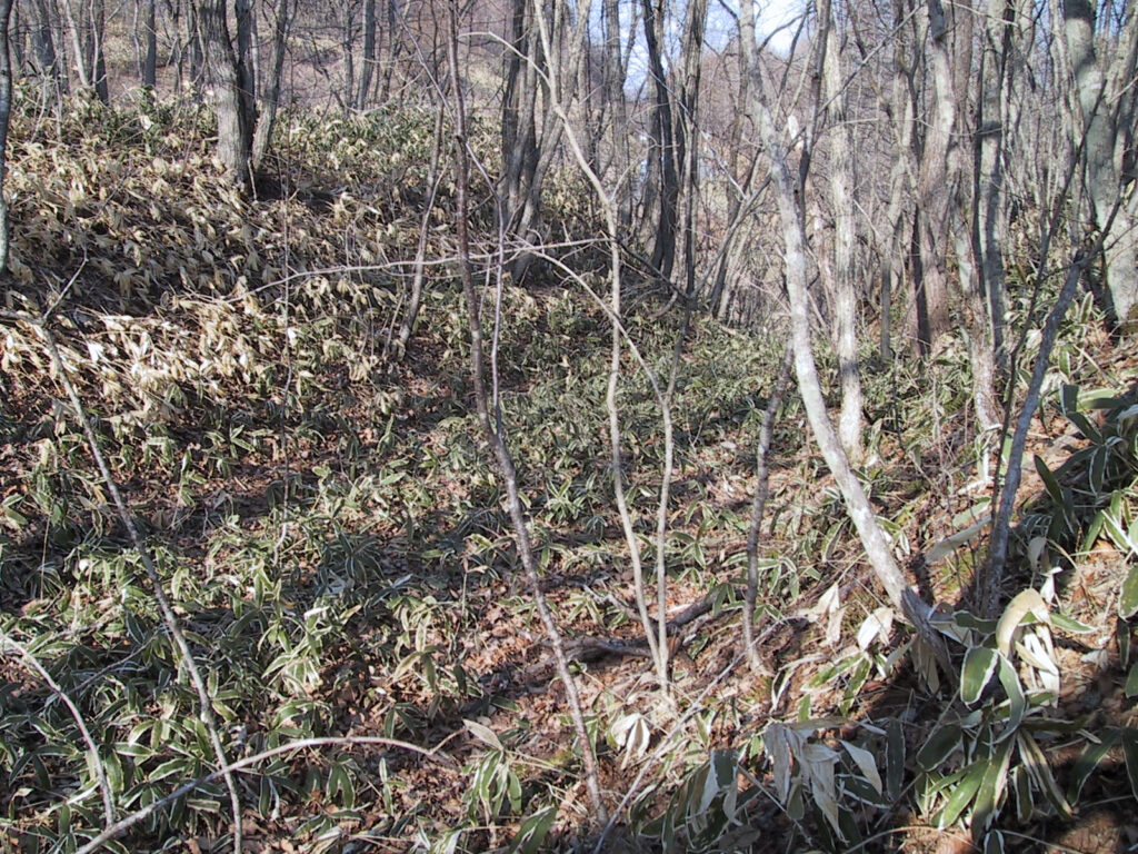 看板があるので、そちら側がチャシなのかと思いきや、看板の右側の方に二段の壕らしきものがあって台地が区切られていたので、そこがチャシだったようです。とはいっても、壕で区切られている部分の広さは畳数枚程度しかなく、壕も深さ1mもない感じですので砦というより見張り場的なものだったような気がします。(2001/4/21)