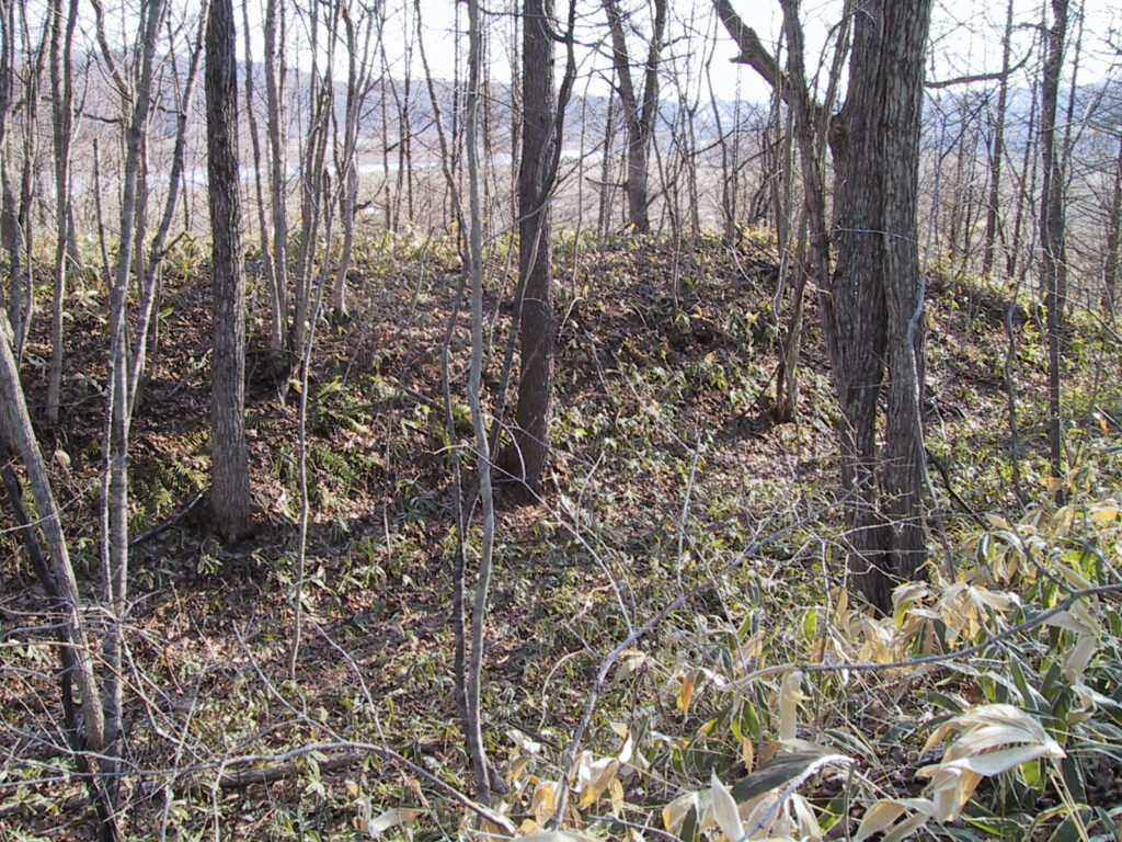 これまた前回発見できなかったチャシですが、今回はあっさり見つけてしまいました(^^;) 「トンネル上のチャシ」という別名通り、旧国鉄富内線のトンネルの上にあり弧状の壕が崖に面して開いていました。壕の深さは1mもなさそうで、壕で区切られている曲輪部分も砦にするには狭く、見張り場的なものだったのかもしれません。(2001/4/21)
