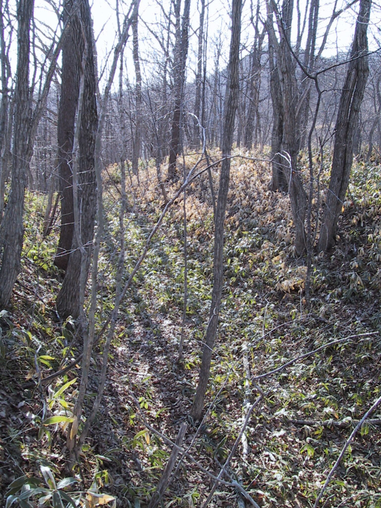 この日は旧FSIRO(niftyの城郭フォーラム)のNACKさんを迎えてのチャシ巡りです。厚真の桜丘チャシのあとはむかわ町穂別へ向かい、まずはイナエップのチャシへと移動しました。ここは2年前に登るのを断念したところですが、NACKさんと相談しせっかくだから登ってみようということになり、長靴に履き替えて登ってみました。NACKさんは写真13の道路側の崖を直登していきましたが、私は右側の端の方から崖の端伝いに登って行きました。そうすると端の方は狭くなっていますが、しばらく進むと開けていて写真10・11の壕が二つ並んでいます。とはいっても写真で言うと手前の方で壕が繋がっていて、丁度V字状になっています。右側の壕(写真10)はそこが平らで広くなっており、深さ2m・幅3~4mはありそうです。左側の壕(写真11)はそれほど深くはなく、深さ1mほどでしょうか? なかなか見応えのある壕でした。後で聞いてみたら、NACKさんもこの日に回った中では、このイナエップのチャシが一番印象に残るとおっしゃっていました。
