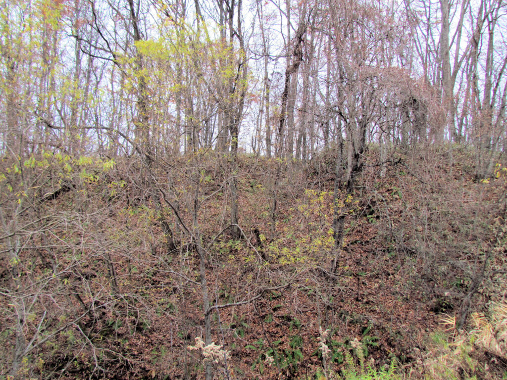 そして穂別最後のチャシがイナエップのチャシです。ここが穂別のチャシではいちばん規模の大きい見応えのあるチャシですが、みんなで話し合った結果、やはりあの切り通し状の崖を登るのは厳しいということになり、下や横から眺めるだけにしました。左側の横から見ると壕があるのは確認できましたが、写真で見るとよく分かりませんね(^^;)