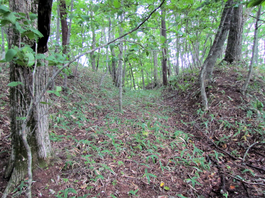 ここは穂別のチャシの中では大きな壕跡が確認できるチャシですが、以前行った時には台地の先端を切り通し状に切断した道路側の急な崖を登って大変で、後から下に道があったのを発見したので、今回はまず下の道を進んでみました。