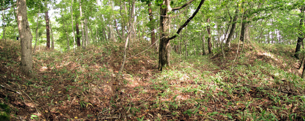 壕はくの字状の一条壕で、規模は約4m×約12m、幅は約1mで北東の方に開いていると『日本城郭大系』にはありますが、探し方が悪かったのか壕も看板も発見できませんでした。