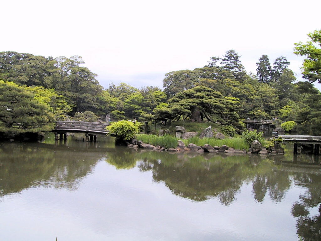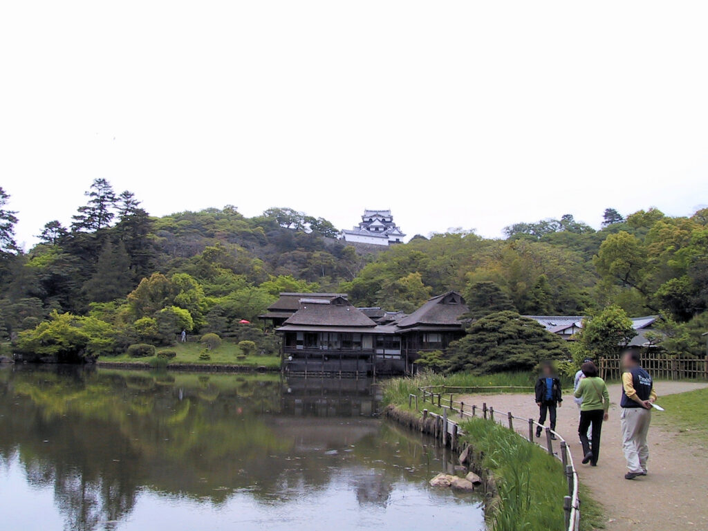 欅御殿(楽々園)から道なりに進むとやがて、東隣の玄宮園へと至ります。ここは欅御殿と同じ頃に造営されたもので、近江八景や竹生島等になぞらえて築庭され、中国・唐の玄宗皇帝の離宮にちなんで命名されました。池泉回遊式の広大な庭園で、庭園中央の鳳翔台からは庭園全体と背後の彦根城天守を望むことができます。