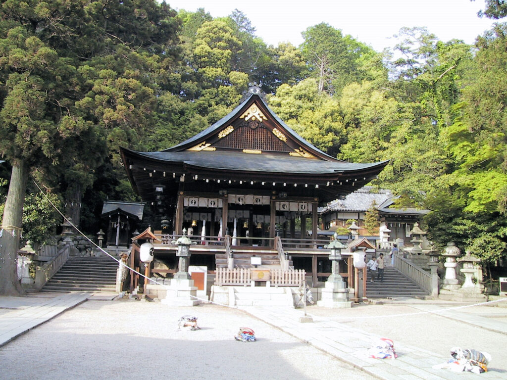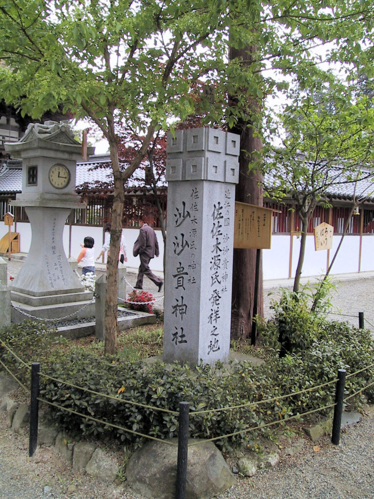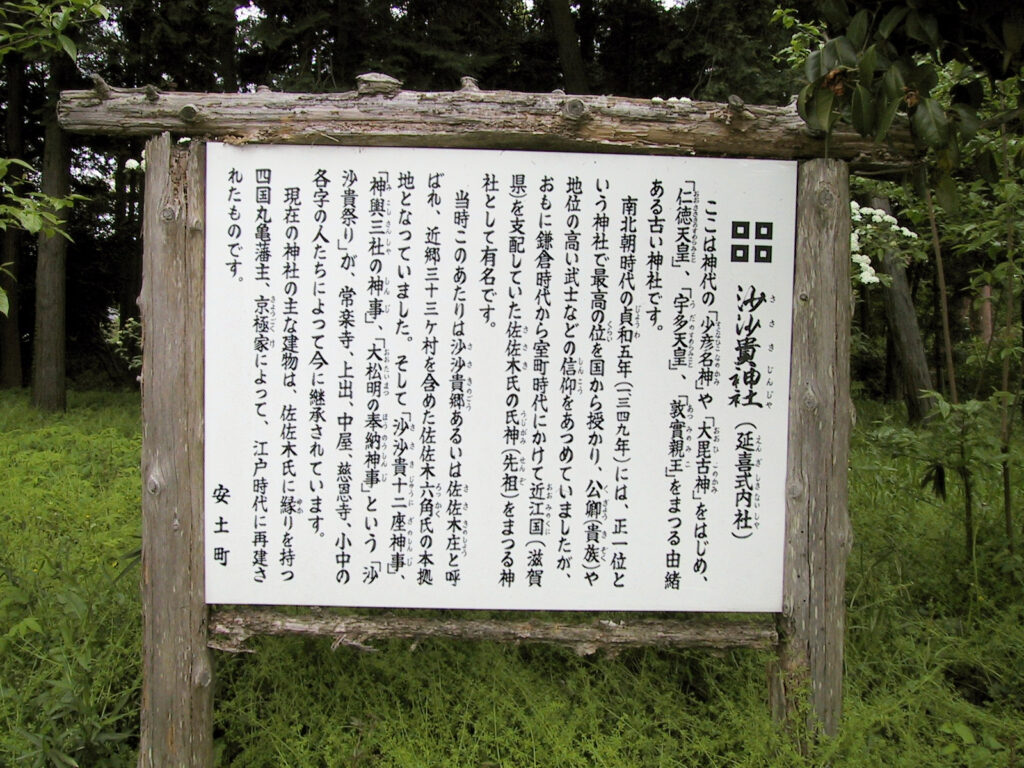 この社は延喜式内社で奈良・平安時代には蒲生・神崎両郡の大領をつとめた狭々城山君(ささきやまぎみ)という豪族の祖神を祀ったのがその起こりとされています。宇多天皇の皇子敦実親王の子孫と称する宇多源氏の佐々木氏は、源頼朝の平家追討の挙兵の武勲により近江守護職に任じられ、その後の勢力拡大の過程で古代豪族狭々城山君の子孫の佐々木氏と同化していったと考えられ、のちには佐々木氏の氏神として、その子孫である京極・黒田などの旧大名や旧財閥の三井氏、乃木希典将軍などに尊崇され、これらの人々が奉納した石灯籠や寄進札なども散見されます。