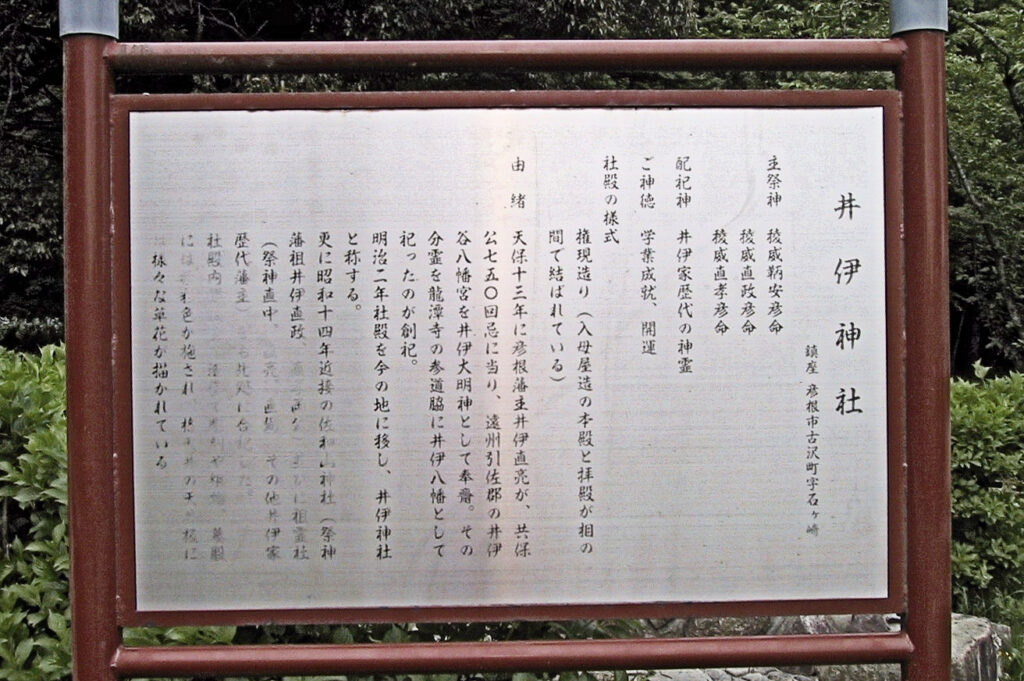 この神社は天保13年(1842)、井伊家の遠祖・井伊共保を祀る神社として創建され、井伊直政・直孝も祀られているそうです。社殿は弘化3年(1846)の建立で昭和13年(1938)に佐和山神社を合祠していますが、あとからびわこさんに聞いたところ今では祀る人がいなくなってしまい、あのような状態になっているとのことでした。周辺の龍潭寺・清涼寺がきれいなだけに何とも残念です。