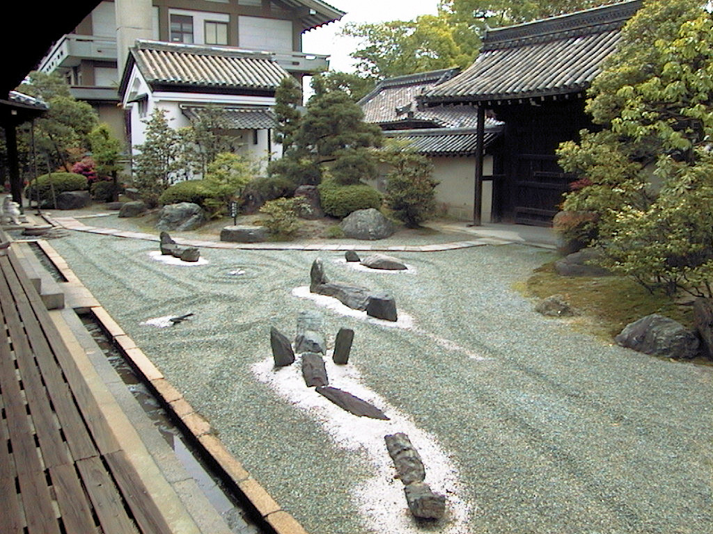 観智院は室町初期の創建で、東寺教学の基礎を成し、多数の教典を有することで知られているそうです。ですが、私たちが心ひかれたのは、その庭園でした。ここの庭園は枯山水の「五大の庭」と呼ばれるもので、小さいながらも心が落ち着く雰囲気がありました。庭園を眺めながら頂く御茶もなかなか風情がありました。