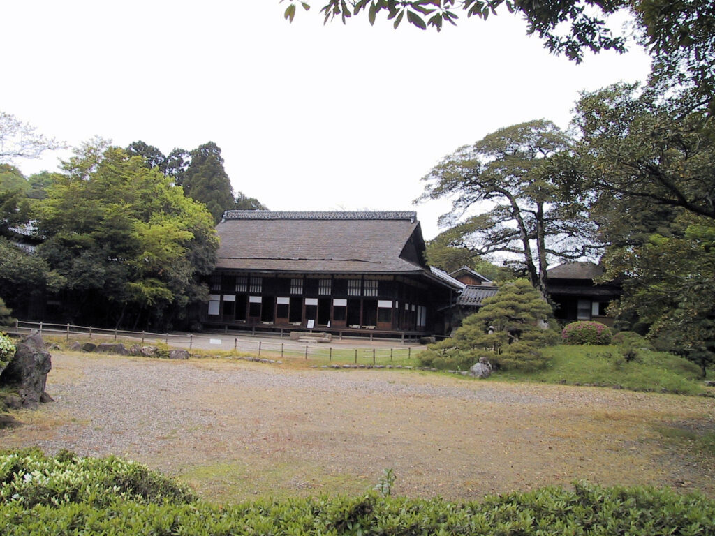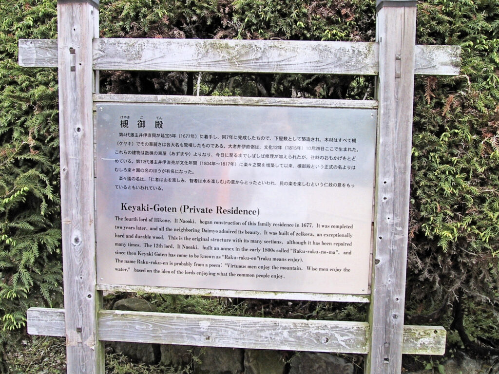 この楽々園、別称槻御殿は延宝年間(1673~81)に四代藩主井伊直興が下屋敷として作ったもので、井伊直弼もここで生まれています。広書院をはじめたくさんの部屋がありますが、中には「地震の間」という部屋があり、ここは普段は御茶座敷として使われていましたが、地震が起きた時に逃げ込めるように地盤を強固にしてあったり、下部の床組に大材を使用して重心を低くするなど耐震構造を意図して作られています。