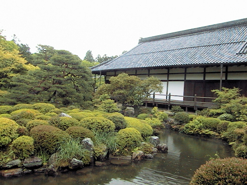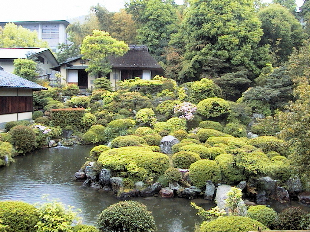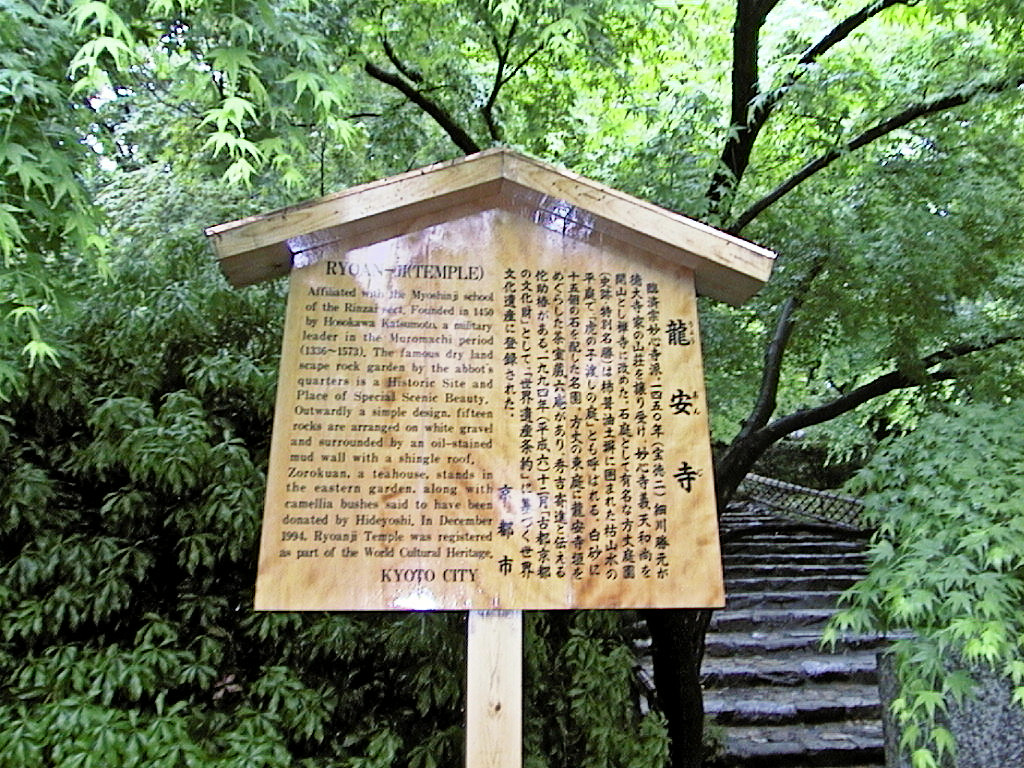竜安寺は、室町時代藤原実能の別荘を細川勝元が譲り受けて寺としたのに始まりますが、その石庭が有名です。土塀に囲まれた長方形の庭に白砂を敷きつめて数個の石を配置しただけのシンプルな枯山水で、”虎の児渡しの庭”と呼ばれる有名な庭ですが、たしかにながめていると心休まる感じがしました。この石庭の模型のようなものもありました。この石庭も良いですが、その右側の方にある苔むした庭園もなかなか良かったです。