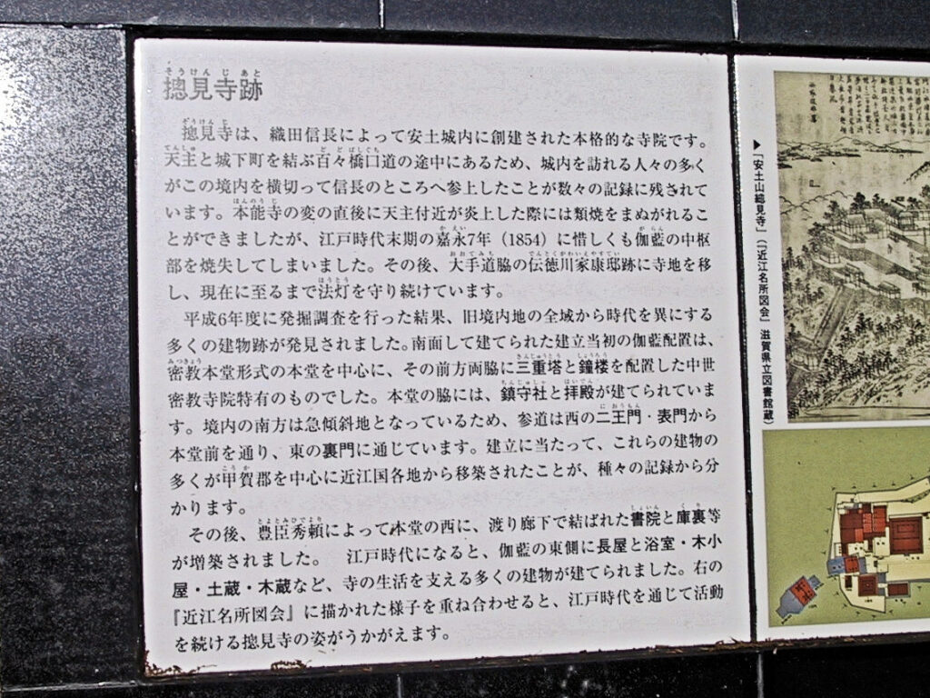 摠見寺は安土城築城の際に、織田信長が自分の従兄弟正仲剛下座元禅師を開山として、甲賀郡の江雲寺を移して建立した寺です。安土城炎上の際もその厄をまぬがれましたが、安政元年(1854)の火災で仏殿・書院・庫裏などほとんどの建物を焼失し、その後旧寺務所のあった大手口の家康屋敷跡の方に移り、当時のものとしては百々橋から上がったところにある仁王門と三重塔だけとなってしまったそうです。