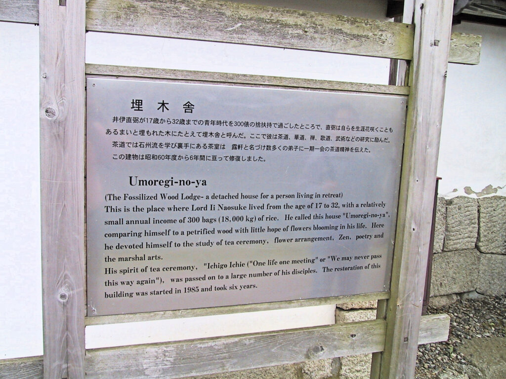 この埋木舎(うもれぎのや)は、幕末の大老井伊直弼が17歳から32歳までの部屋住み時代を300俵の捨扶持で過ごした所です。直弼は父・直中の十四男で他家の養子となることも叶わず、自らを生涯花咲くこともあるまいと埋もれた木にたとえて埋木舎と呼び、ここで茶道・華道・禅・武道等の研究に励ました。しかし嗣子のいない長兄直亮の養子となり、彦根藩主、さらに幕府の大老へと昇進し、波乱の時代の幕政をリードしたものの、桜田門外の変で凶刃に倒れその生涯を閉じました。