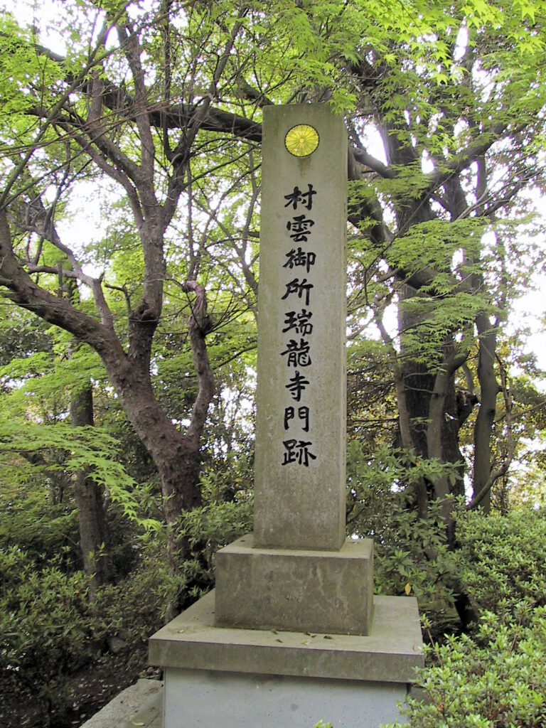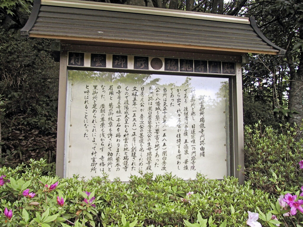 旧八幡城の本丸は、現在瑞龍寺となっていますが、この瑞龍寺はもともとは京都村雲の地にありました。その創建は日秀尼といい、この八幡山城の城主だった関白豊臣秀次の母、つまり豊臣秀吉の姉「とも」だったのです。ともは秀次自害後出家して日秀尼となり、その菩提を弔い瑞龍寺を建てましたが、昭和38年(1963)に村雲から秀次ゆかりのこの城跡に移築され、現在に至っています。