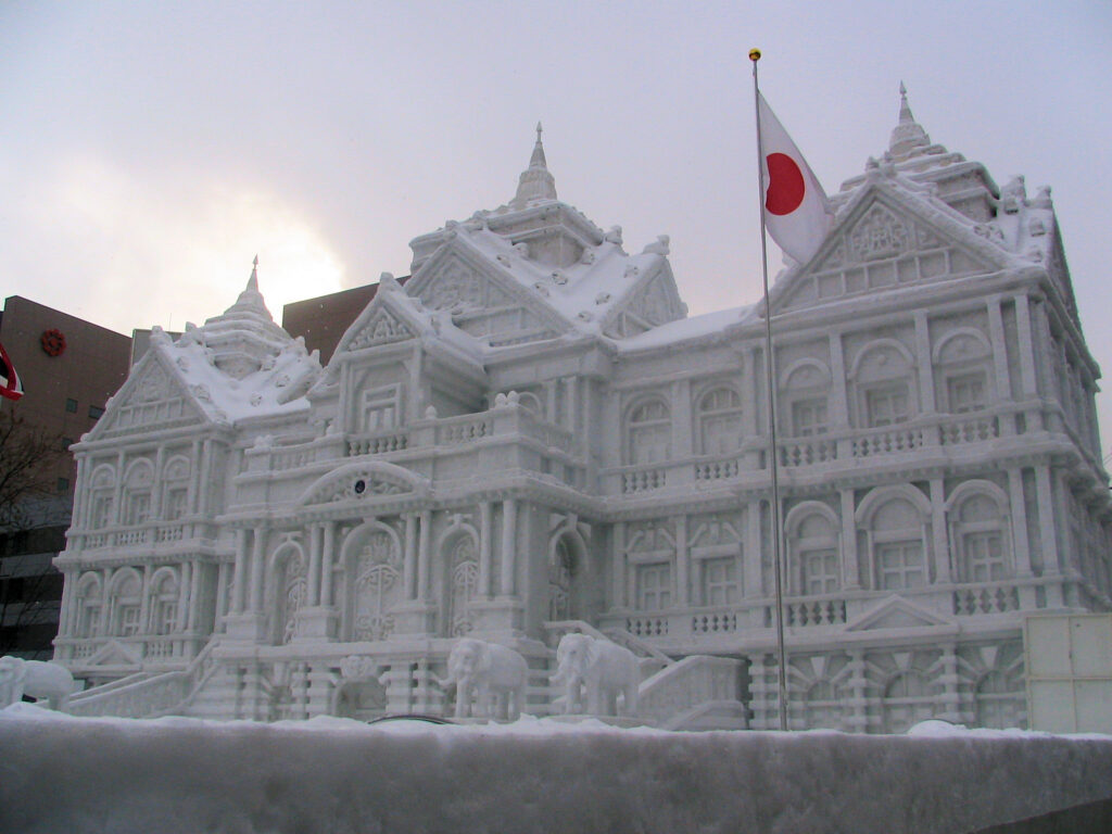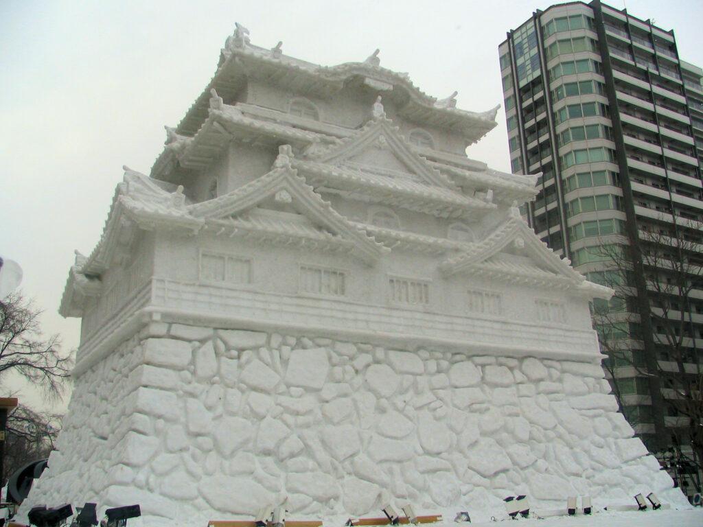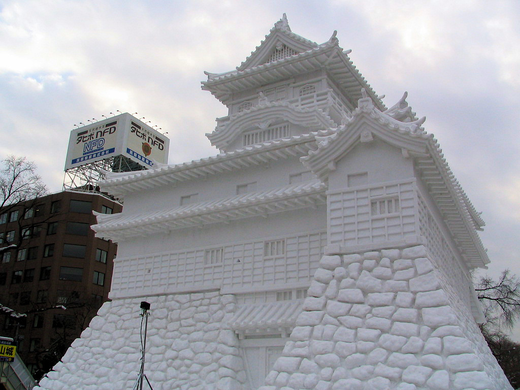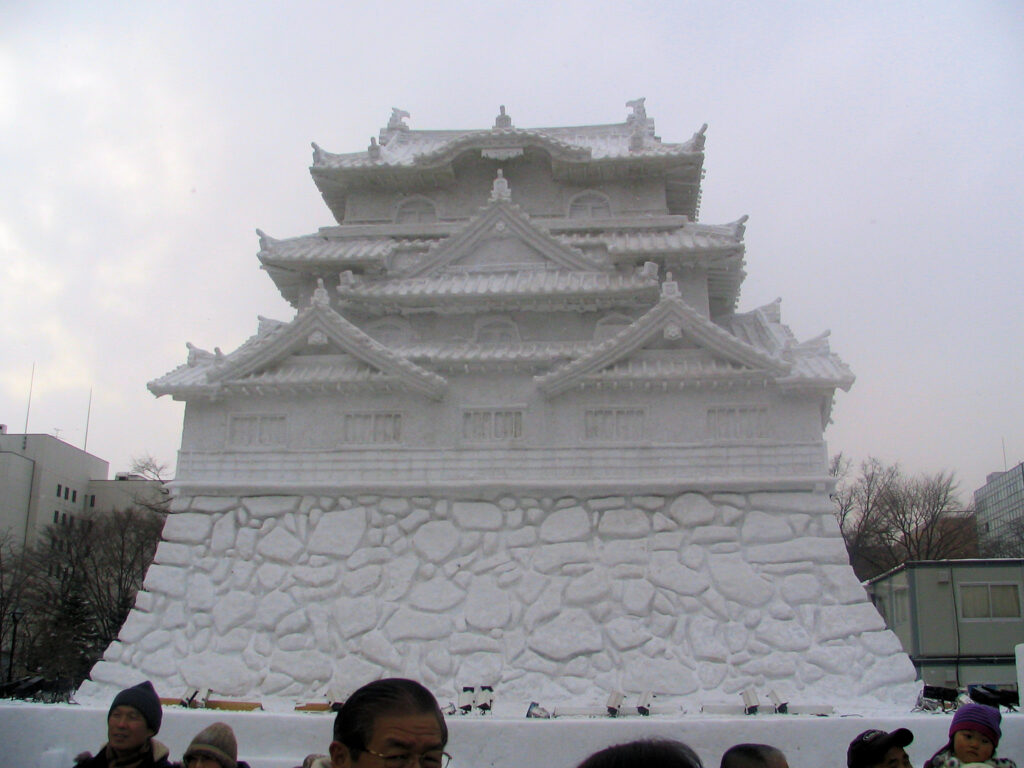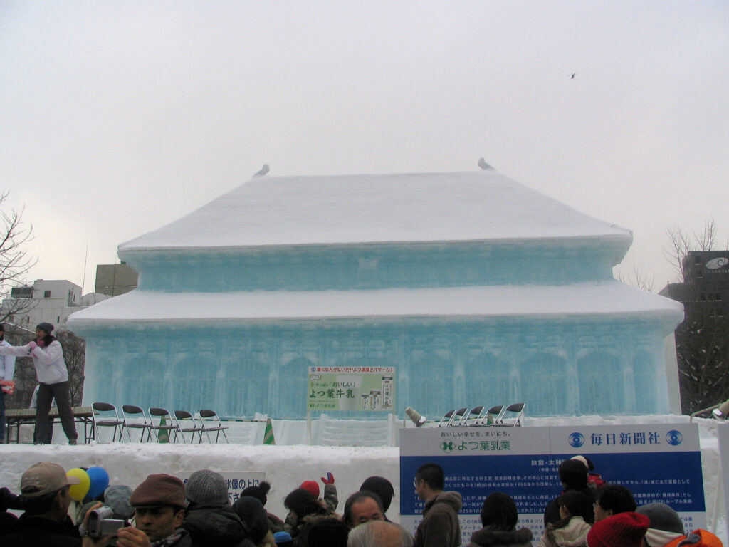 大通り3丁目辺りから順々に見ていきましたが、5丁目の大氷像・大英博物館、7丁目の大雪像・紫禁城太和殿はなかなか迫力もあってきれいでした。江戸城は大通8丁目HTB広場にありまして、なかなか細かい所まで作っていていい出来でした。ただし、作られているのは天守の周り三面だけで、残りの一面は雪面そのままなので隠されてますけど(^^;)