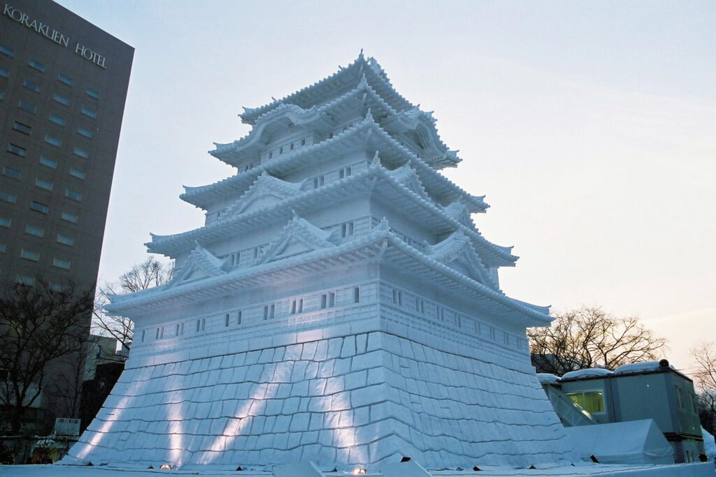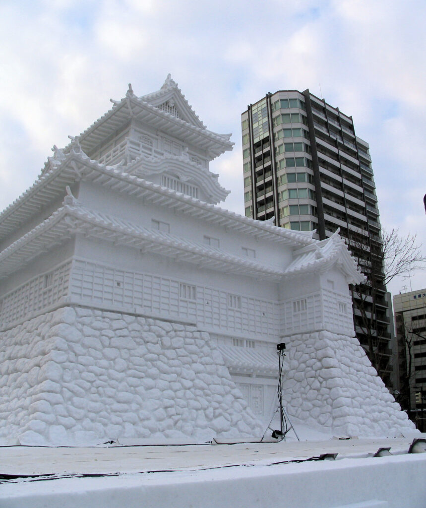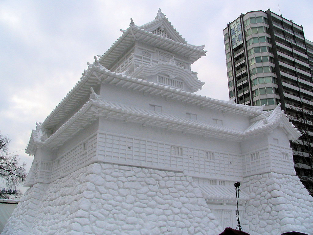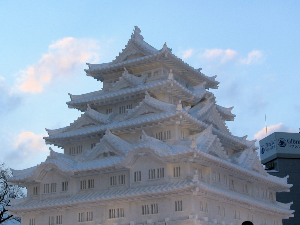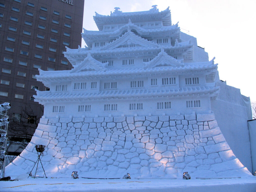 大通り3丁目辺りから順々に見ていきましたが、5丁目の大氷像・大英博物館、7丁目の大雪像・紫禁城太和殿はなかなか迫力もあってきれいでした。江戸城は大通8丁目HTB広場にありまして、なかなか細かい所まで作っていていい出来でした。ただし、作られているのは天守の周り三面だけで、残りの一面は雪面そのままなので隠されてますけど(^^;)