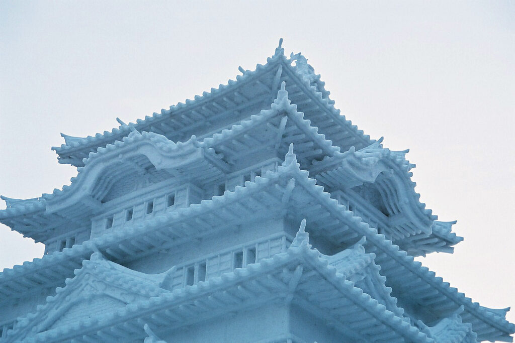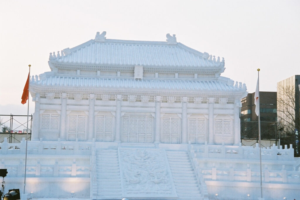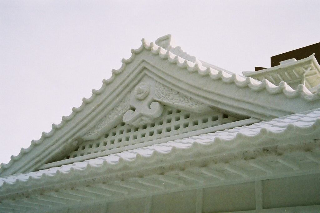 例年○○の○○年祭ということでお城などの大雪像を作っているようですが、今年は彦根城400年祭ということで彦根城になったようです。まずは大通2丁目から3人で手をつなぎながら歩いていきました。大通5丁目は中国・故宮の太和殿の大氷像です。屋根に雪が掛かっていましたがなかなかきれいなものです。