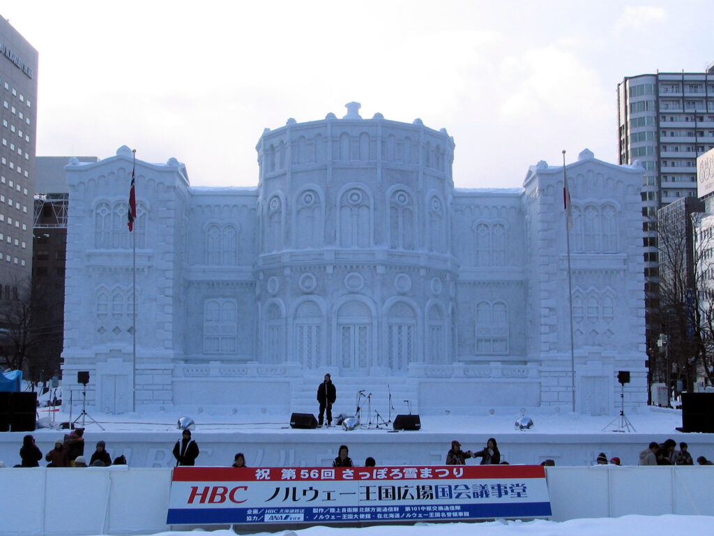 この前日は大雪、この日も午前中雪が降っていたので心配しましたが、午後からは晴れて良い天気でした。でもえらく冷えまして、6丁目で肉まんとコーンクリームスープをいただいて暖まって来ました。最初に大通7丁目の「ノルウェー王国国会議事堂」、次に8丁目の「名古屋城」、そして5丁目の「ライプチヒ旧市庁舎」等を見て早々に帰ってきました。昨年来の韓流ブームを受けてかヨン様の小雪像の前に人だかりができていたのには笑っちゃいました(^^;)