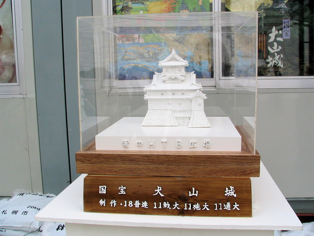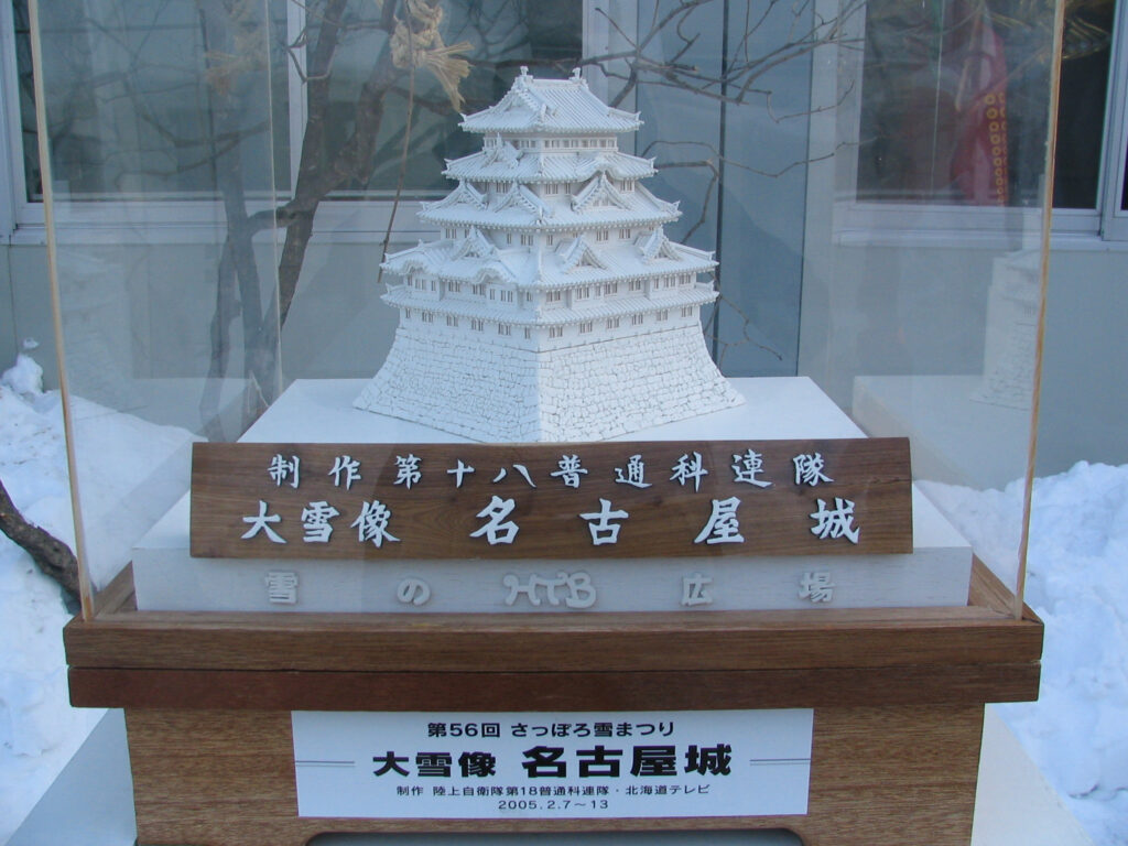 今年のお目当ても一昨年大雪像「江戸城天守」を作成し、昨年は大雪像「箱館奉行所と土方歳三」を作成した大通8丁目HTB広場の大雪像「名古屋城」です。昨年の中日ドラゴンズ優勝、そして今年の3月に愛知万博があるということで名古屋城になったようです。昨年と同じく名古屋城の雪像の模型もありました。