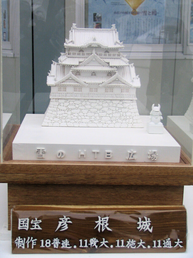 さてそしていよいよ8丁目HTB広場の彦根城です。本物は6年前にお目に掛かってきましたが、それと比べてもなかなかのできです。今年は暖冬で、ついこの間は例年なら降ったことのない雨が降るという異常気象でしたので、多少溶けて崩れた感はありますが、細かなところまで再現していたのには感心しました。