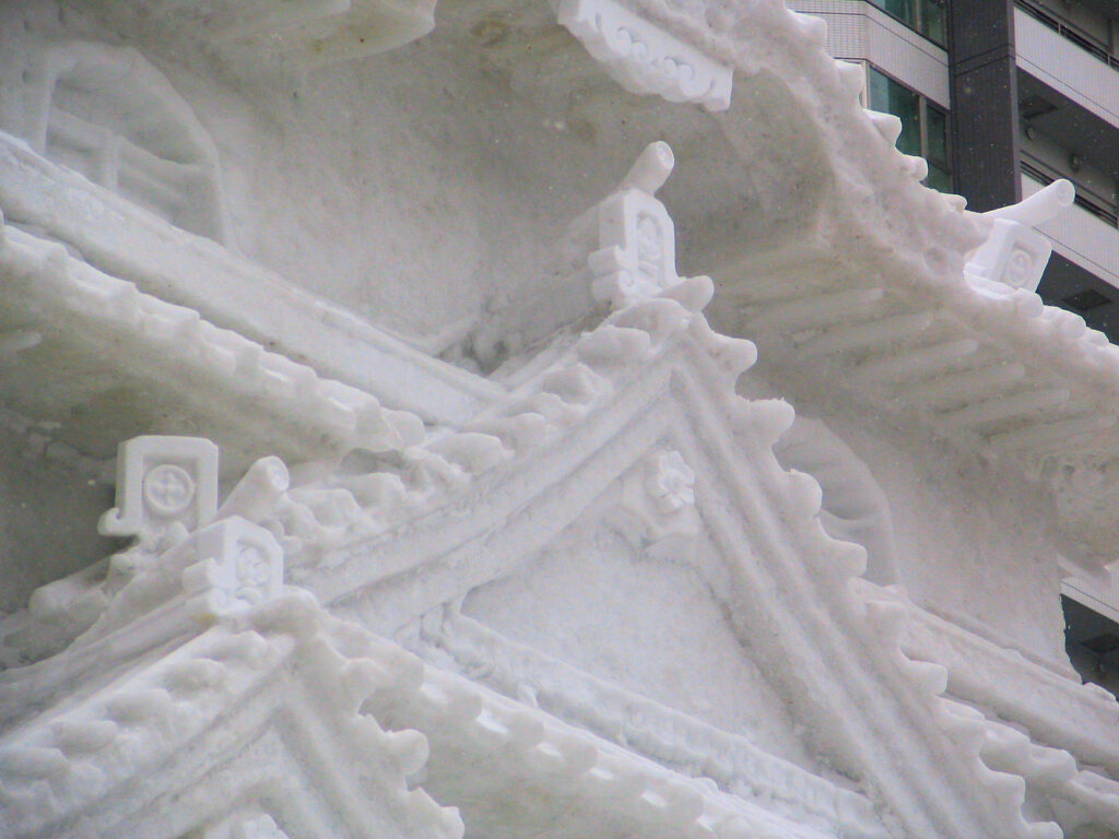 あと、ちょっとはっきりした場所は忘れましたが、9丁目か19丁目の市民の広場の中に「天使閣」と題した天守風の雪像がありました。こちらは高さが1mほどの小さいもので、最近の暖気でちょっと形が崩れてしまっていたのが残念でした。